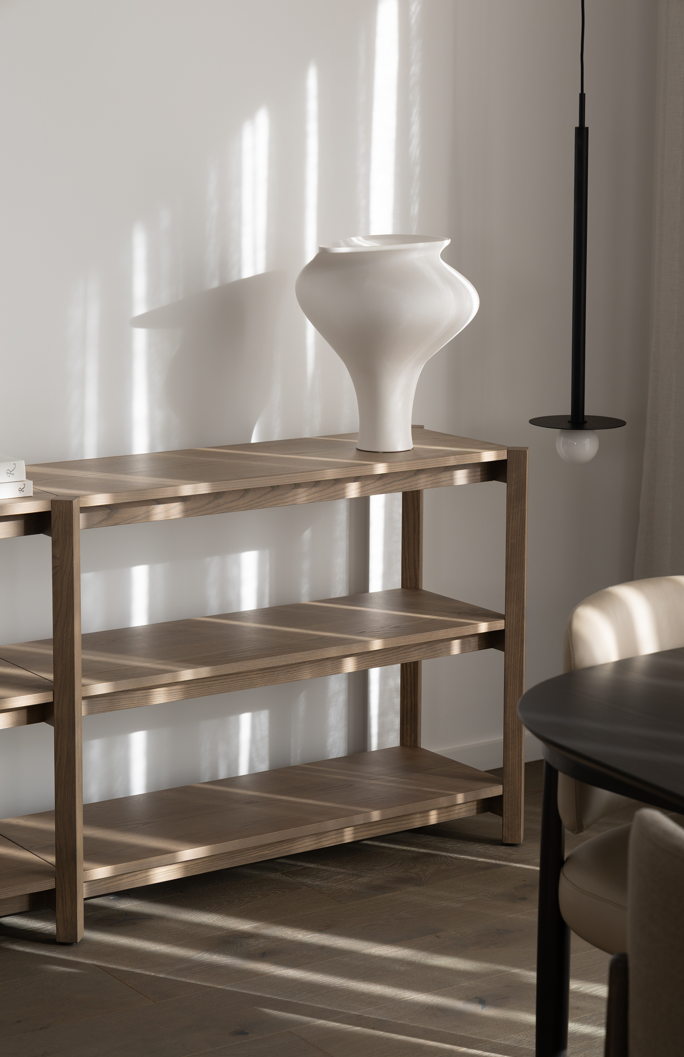 A modular shelving system, Ascent offers an understated form through negative detailing and angled square legs. Ascent is also available in a high bay option.