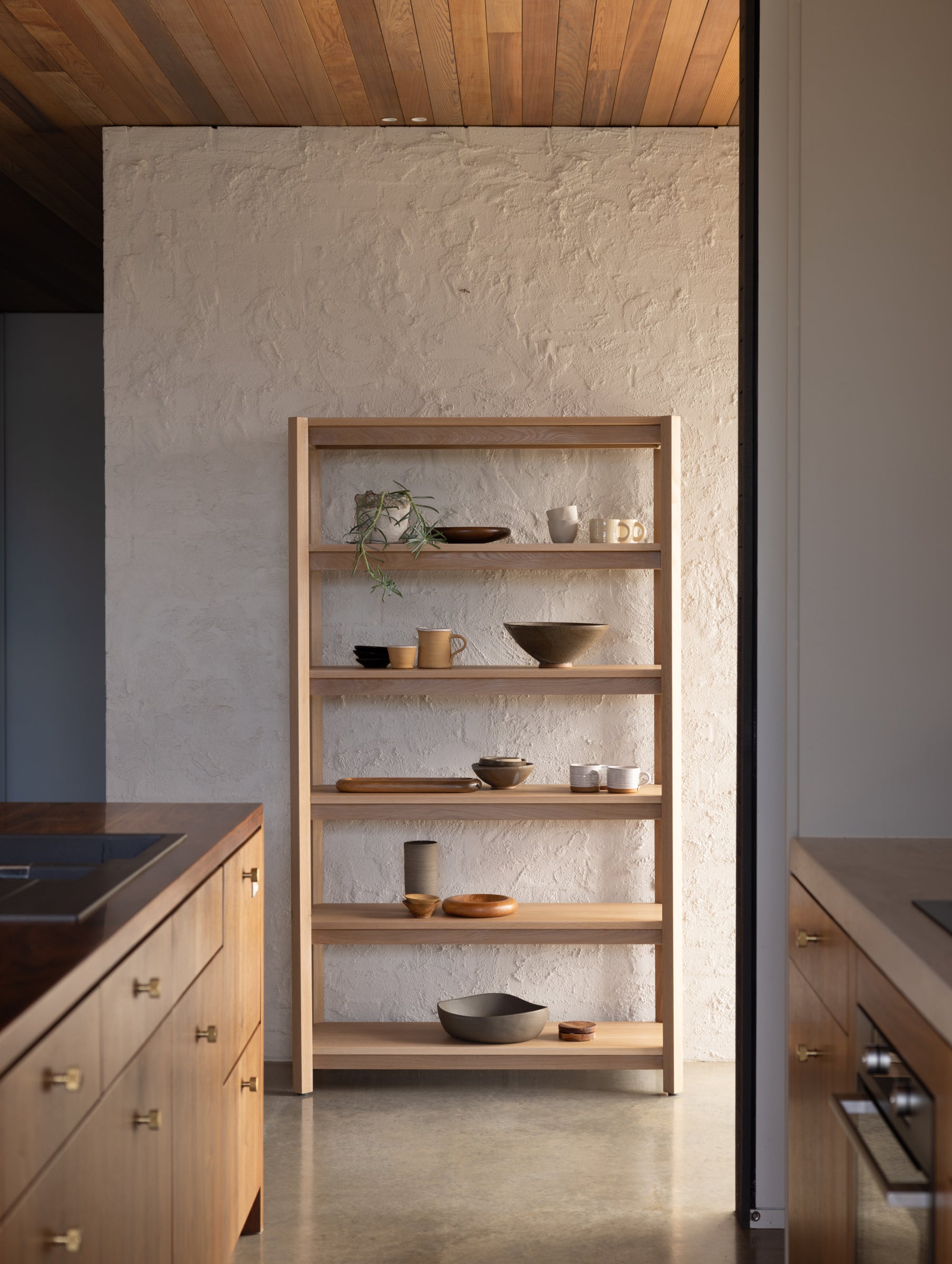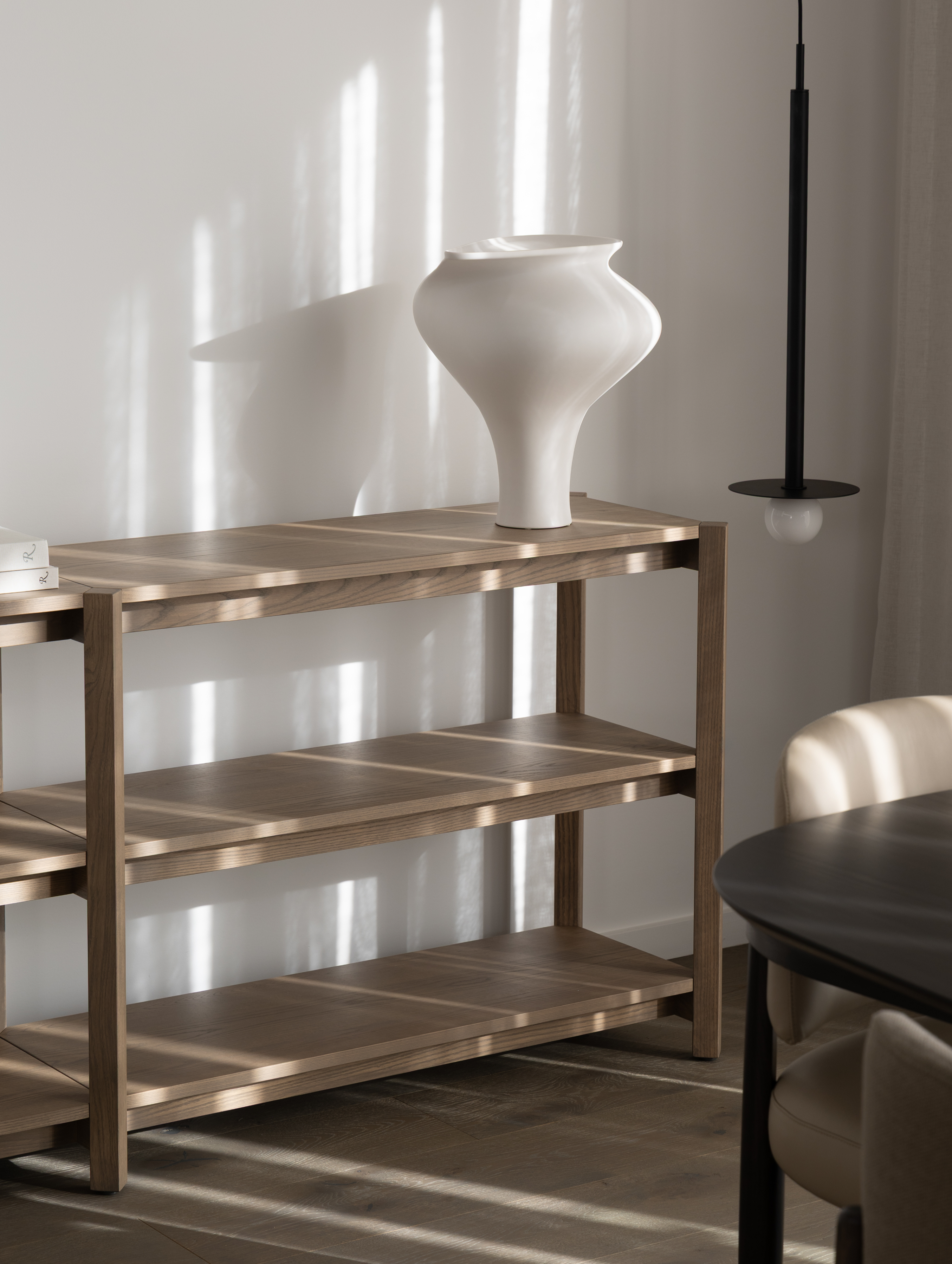A modular shelving system, Ascent offers an understated form through negative detailing and angled square legs. Ascent is also available in a high bay or single bay option.