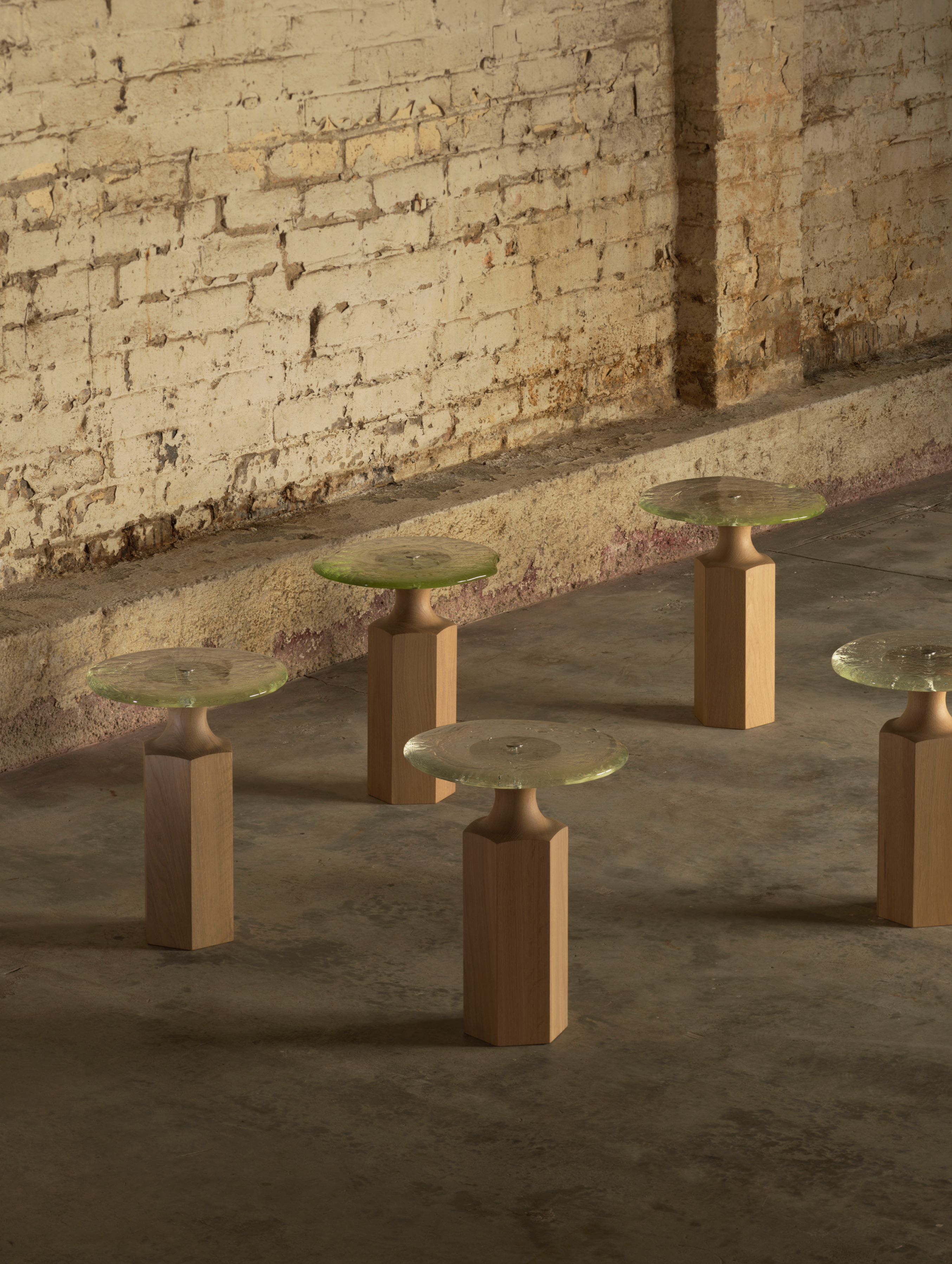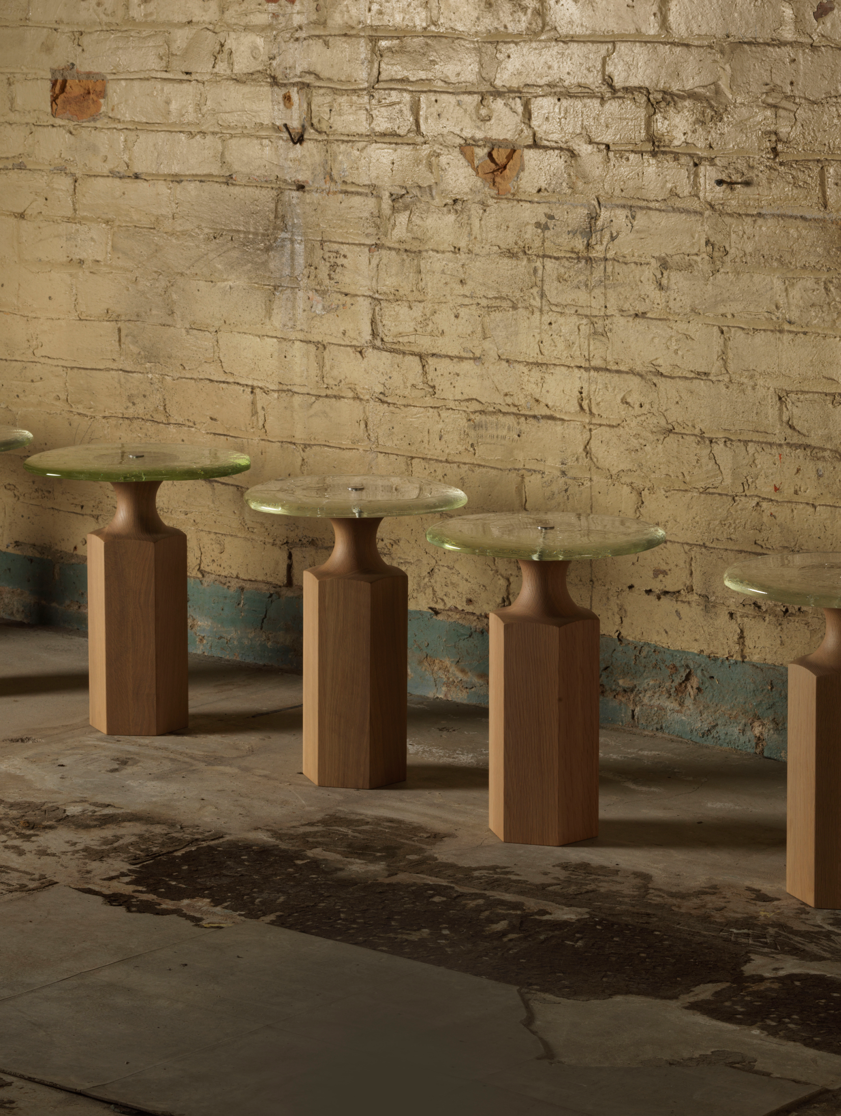 A collaboration with Buster Caldwell, Bouba–Kiki are two side tables where timber meets glass. Tiny ripples and bubbles in the glass, poured by Luke Jacomb, catch the daylight. Where Bouba glows, Kiki grounds – a considered pairing.