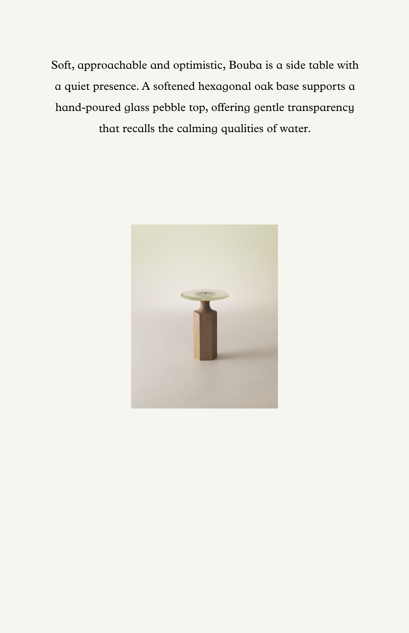 Soft, approachable and optimistic, Bouba is a side table with a quiet presence. A softened hexagonal oak base supports a hand-poured glass pebble top, offering gentle transparency that recalls the calming qualities of water.
