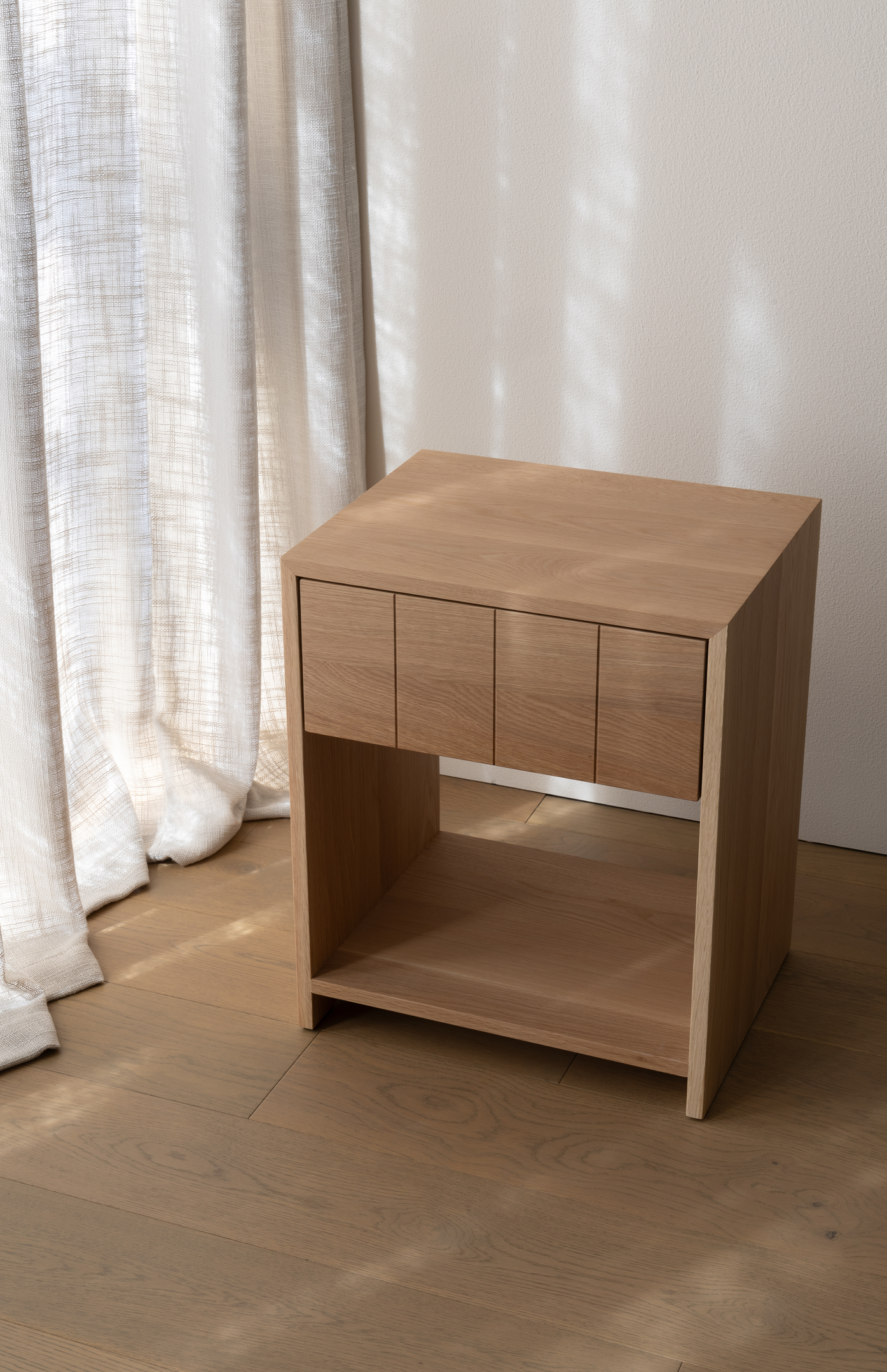 A solid timber bedside defined by a simple form with vertical panel detailing. Channel features a single drawer and an open shelf bringing visual lightness and further functionality.