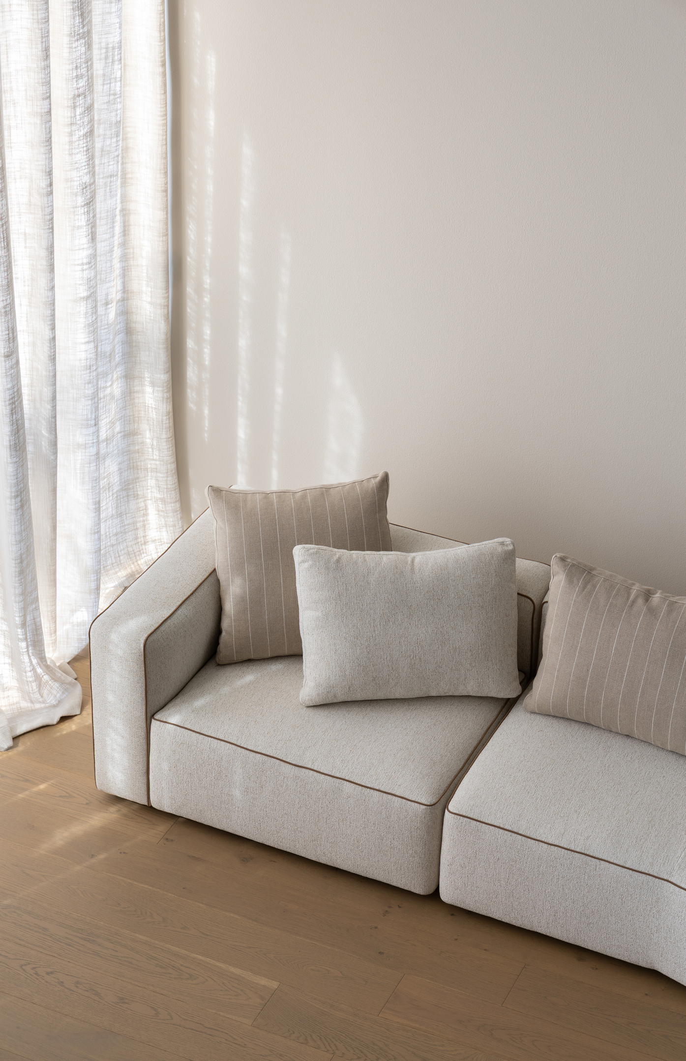 Charly is a sophisticated modular sofa characterised by feature piping. Its versatile range of modules, from straight to asymmetrical and curved, allow for adaptable combinations, creating a tailored and distinctive appearance to suit any space. Designed for everyday use with low maintenance and supportive comfort.