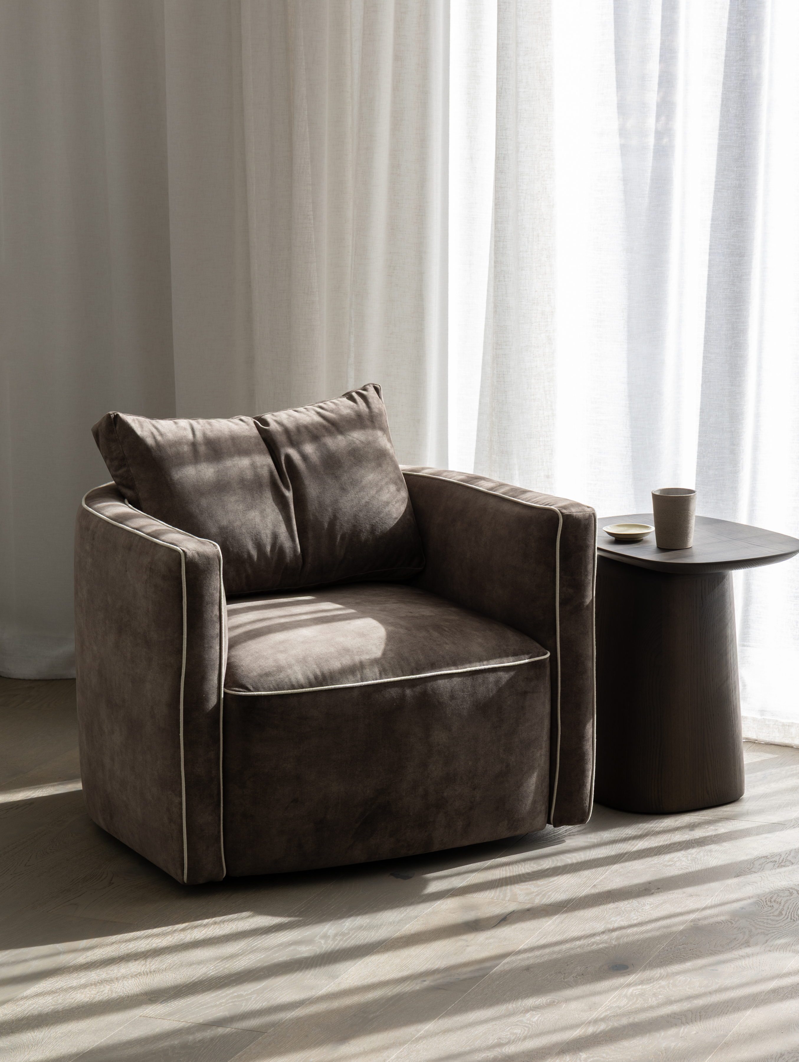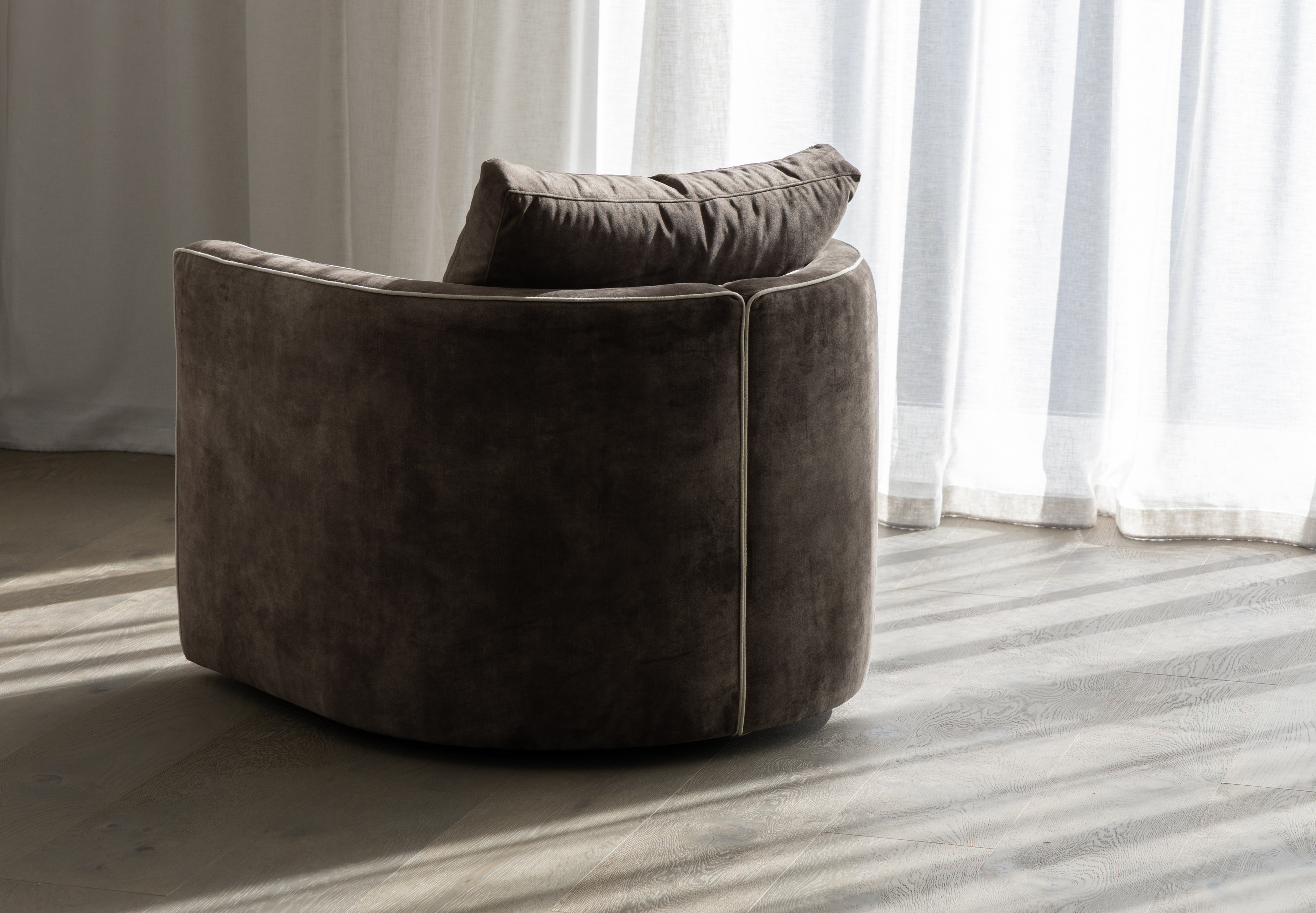 Charly is a sophisticated tub chair characterised by feature piping. With a swivel base, Charly sits well in a corner, or in a pair. Designed for everyday use with low maintenance and supportive comfort.