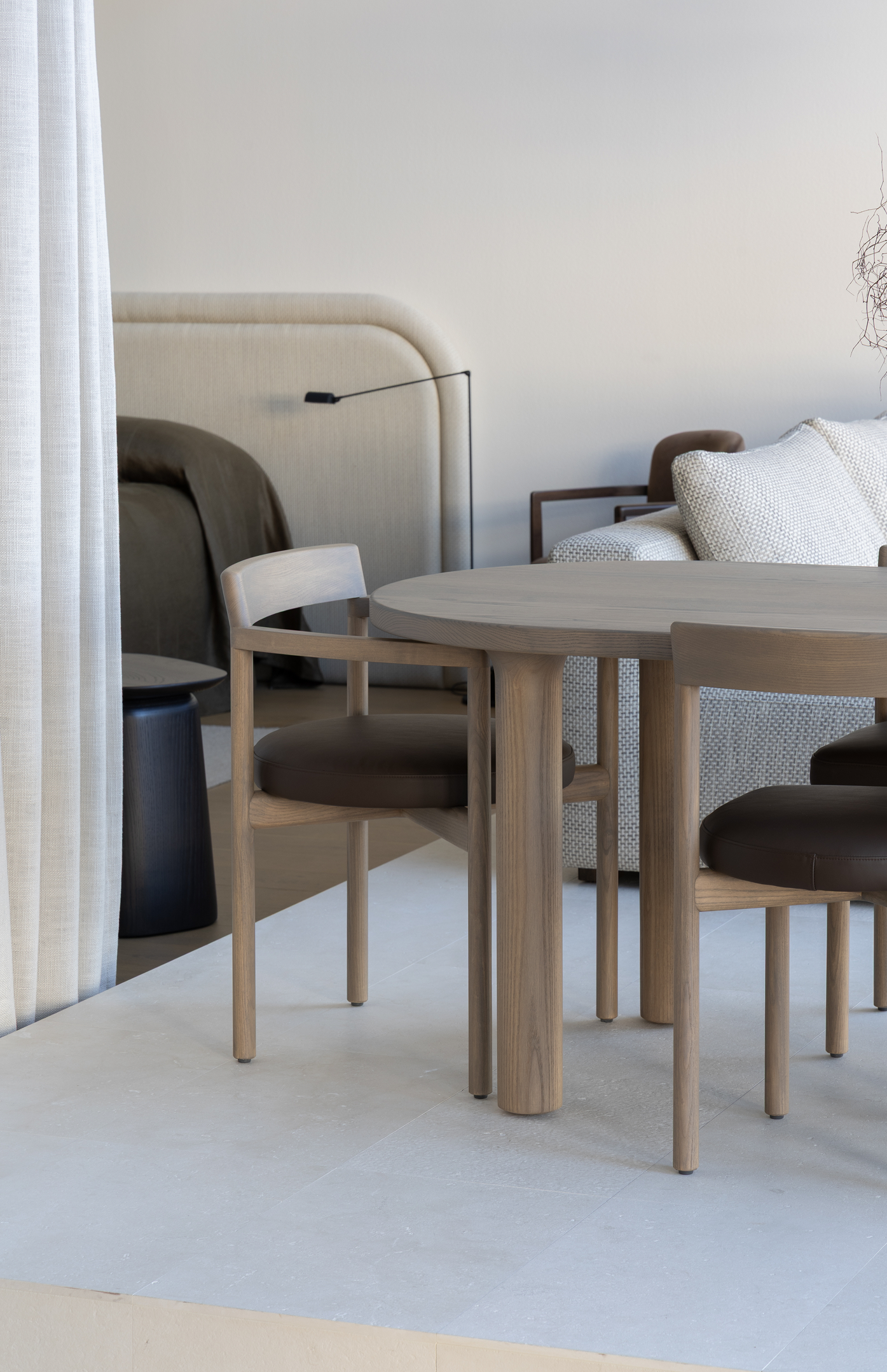 A thoughtfully crafted dining table, Contour features a pill-shaped top and rounded legs. Each leg is hand-sculpted to merge with the tabletop, creating a seamless transition between the two elements.
