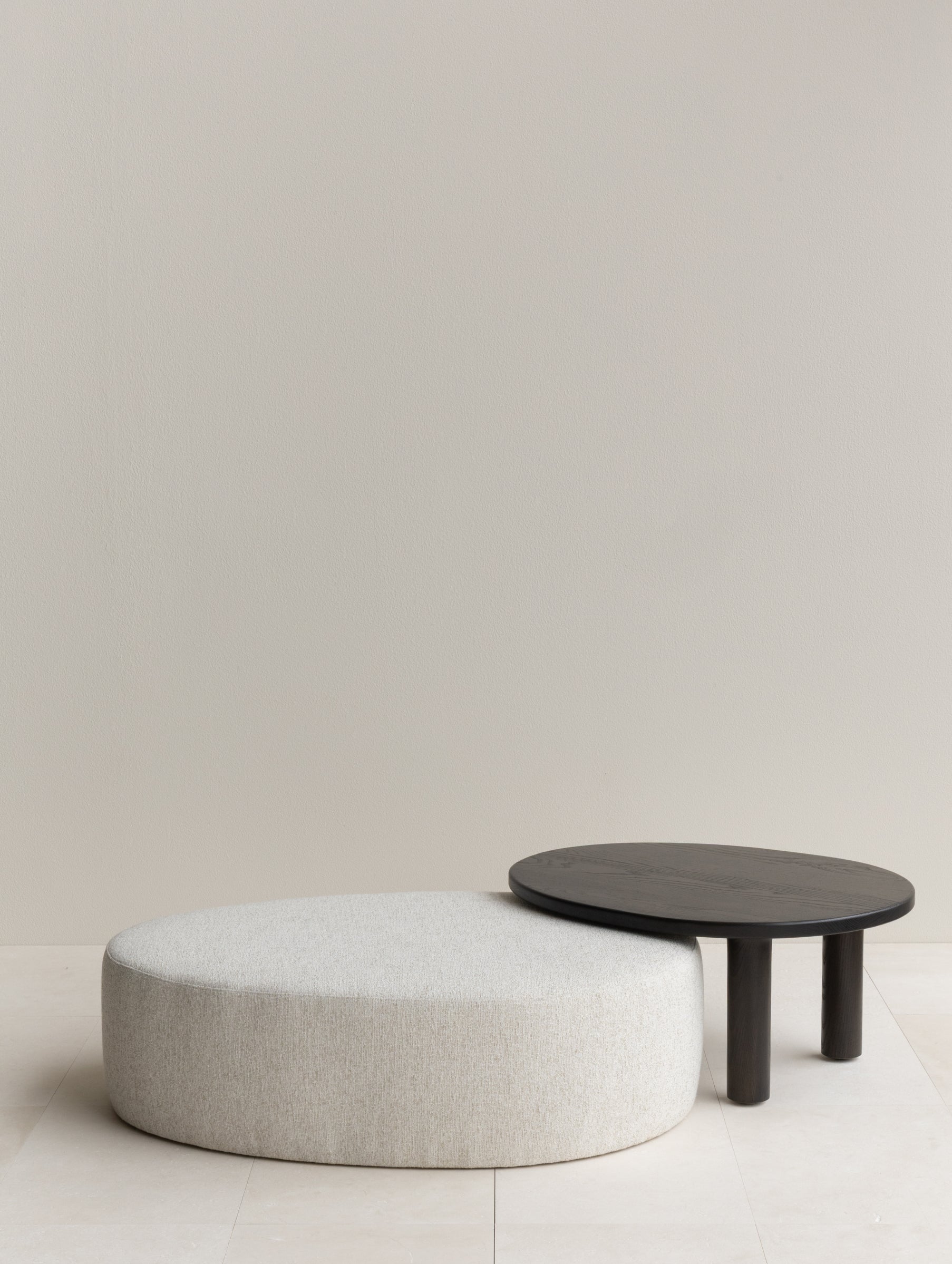 Asymmetrical in profile, Contour features a fully upholstered ottoman and smaller, solid timber table. Whether used together in a nest or independently, this set seamlessly integrates into various living spaces.