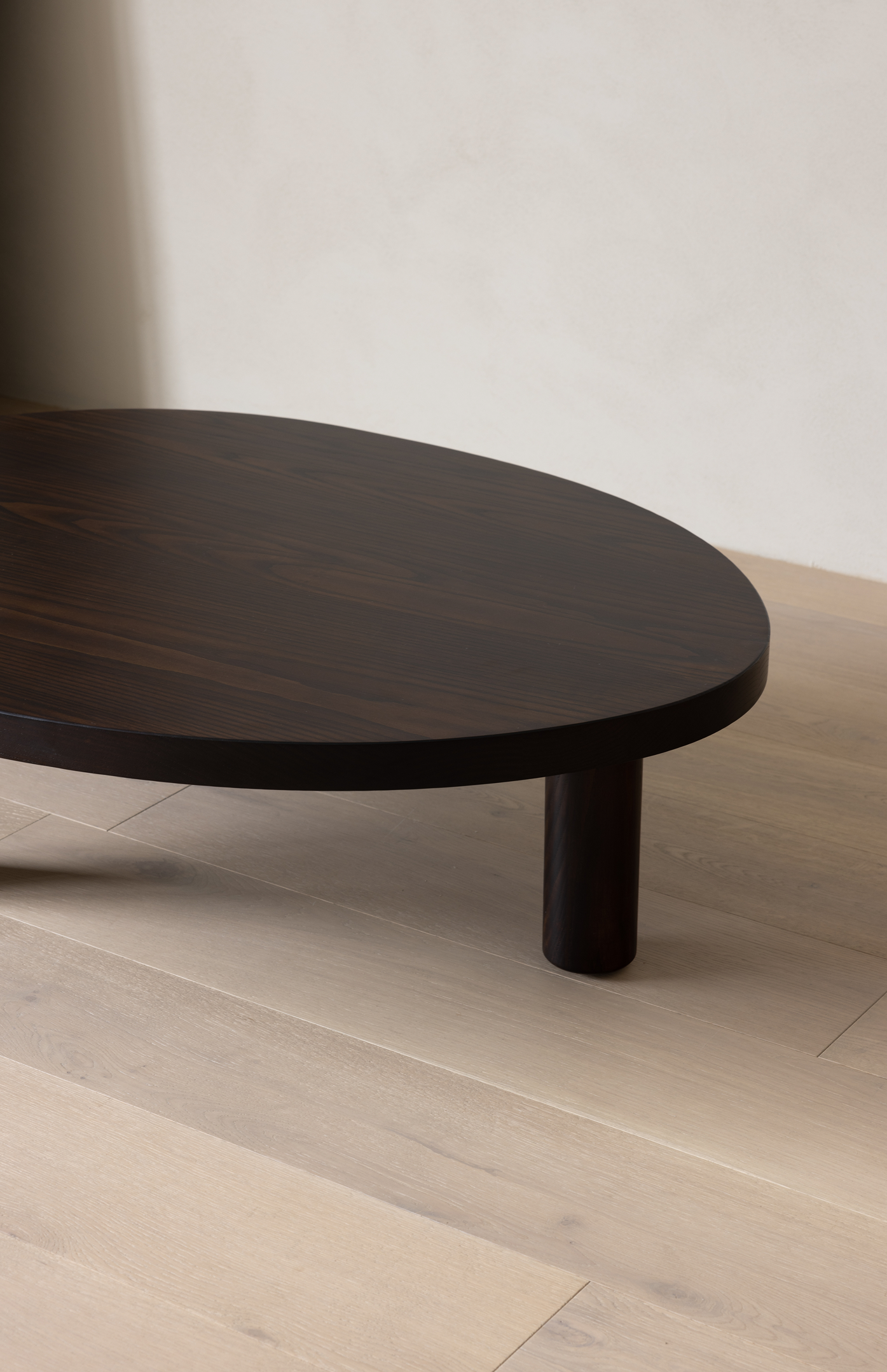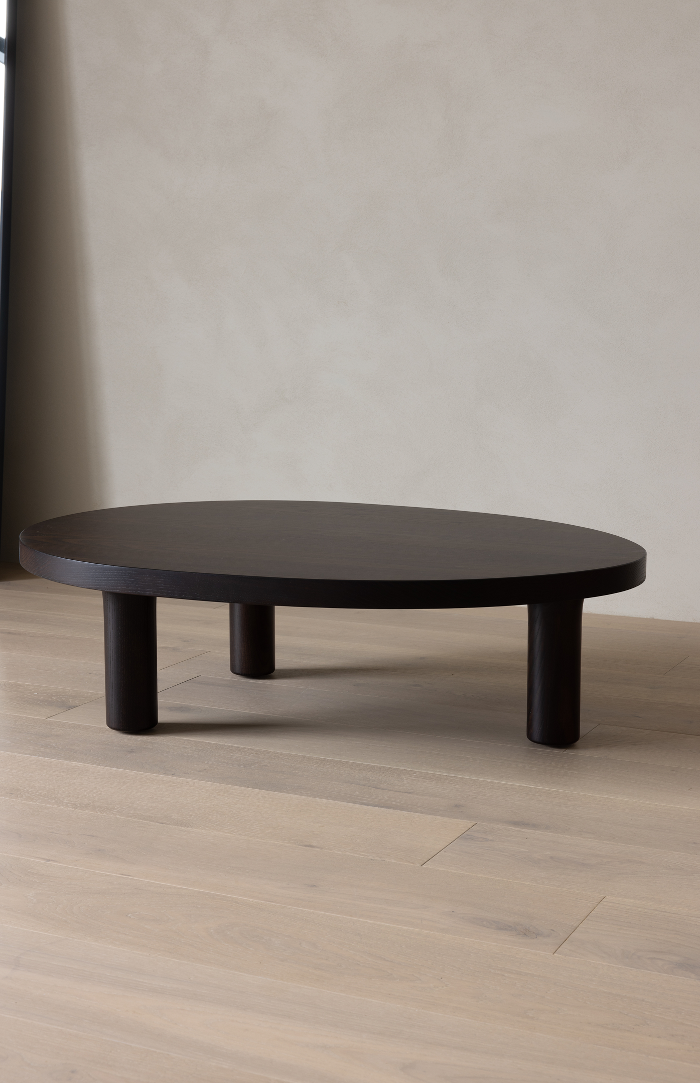 Asymmetrical in profile, Contour features an ovoid shaped coffee table with three rounded legs. Each leg is hand-sculpted to merge with the tabletop, creating a seamless transition between the two elements.