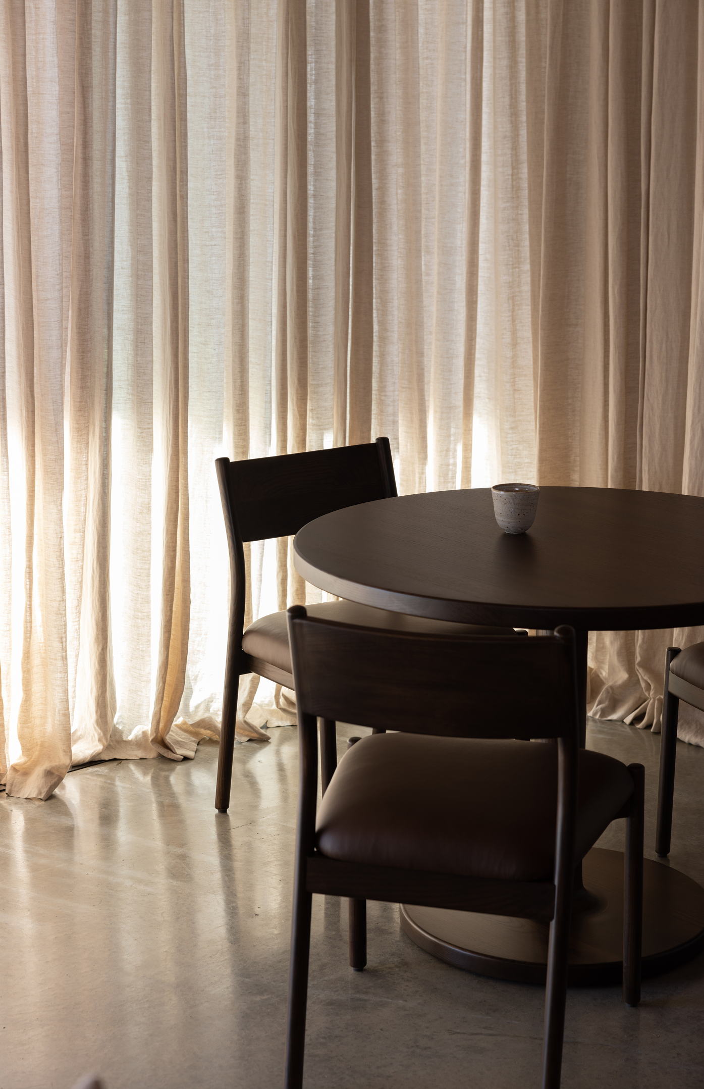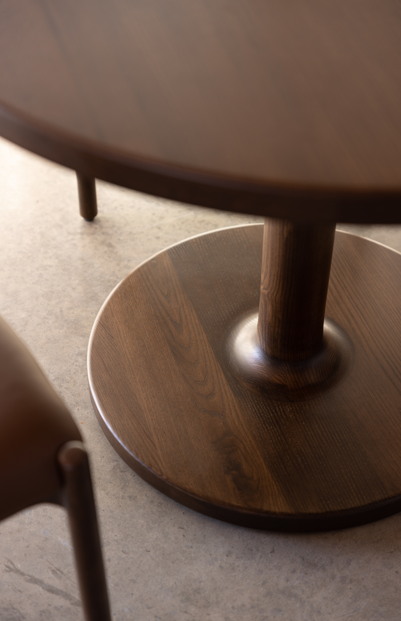A versatile pedestal dining table, Contour retains a soft character through considered curved edges. A single rounded leg is hand-sculpted to merge with the tabletop and base, creating a seamless transition between the two elements.