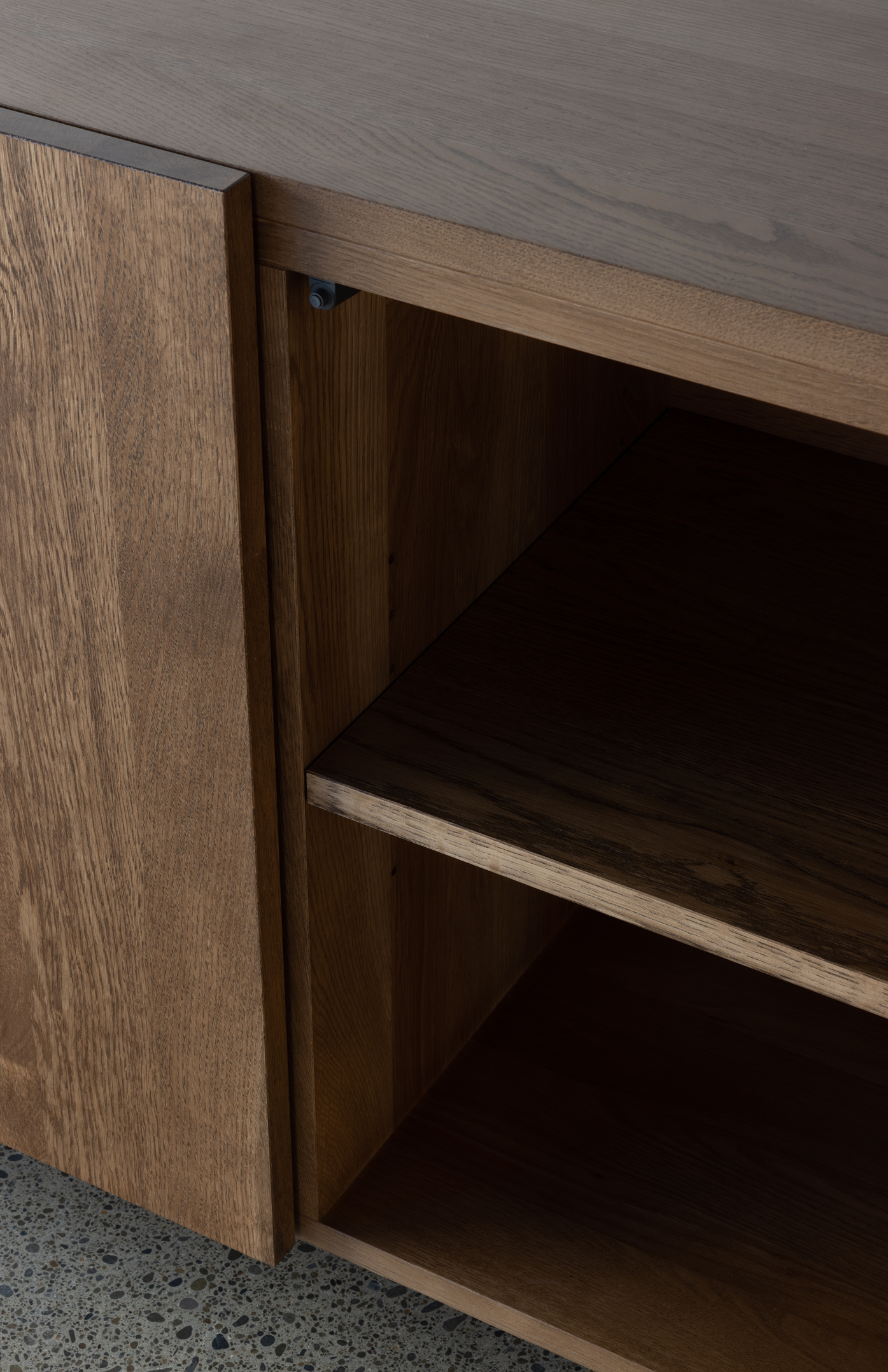 An honest expression of flat timber planes with contrasting softened recessions, Depot is a family of functional drawers and cabinets. A three-door sideboard designed for living spaces.