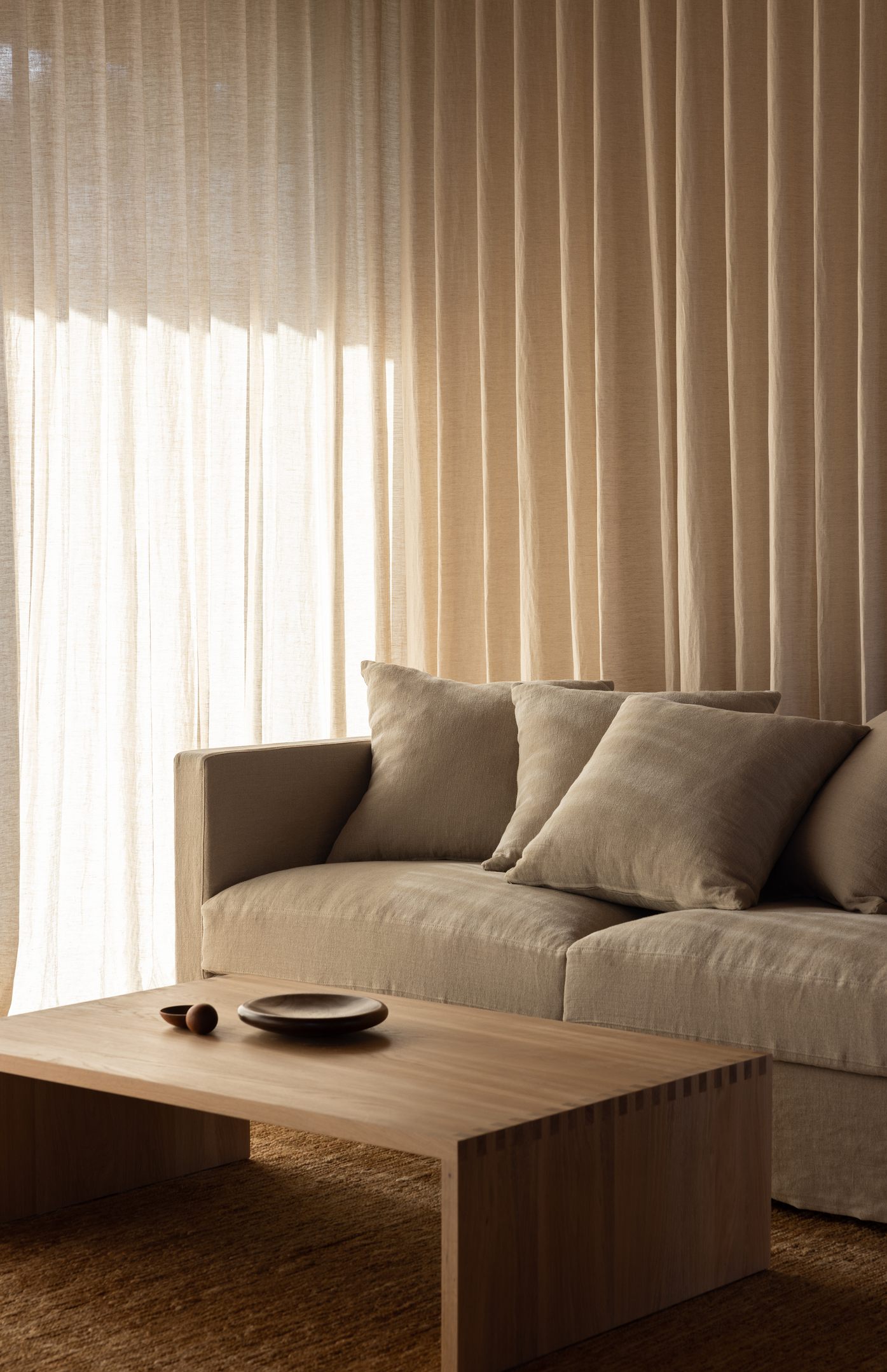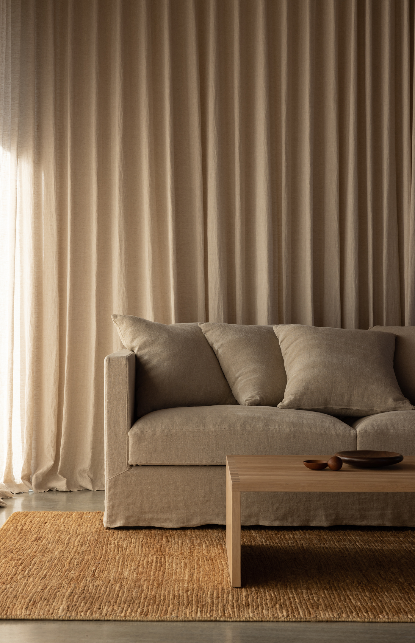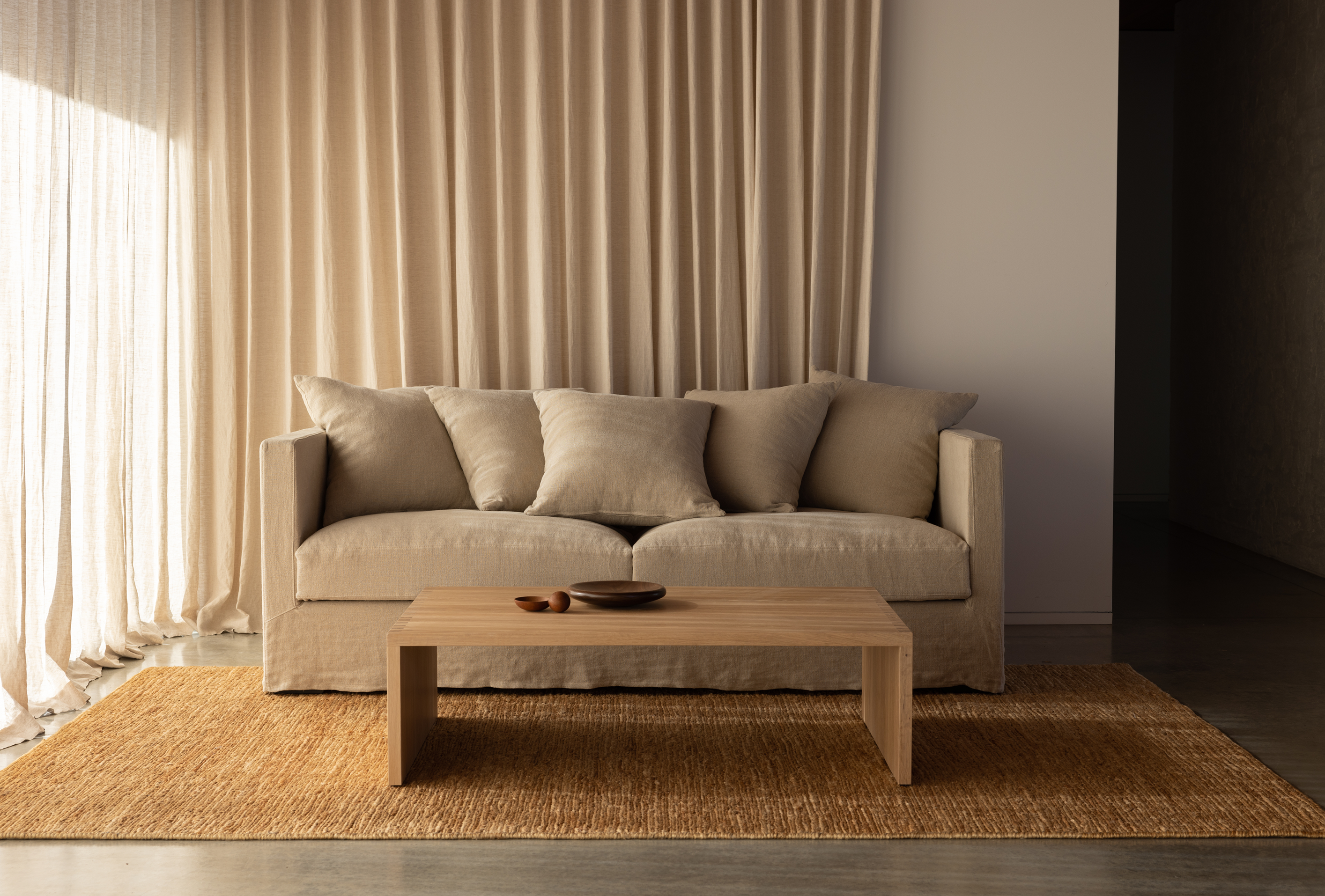 An inviting slipcover sofa with a refined edge, characterised by a relaxed and generous form. A feather scatter cushion back and square upholstered arms are refined to find an ideal balance of comfort and support.