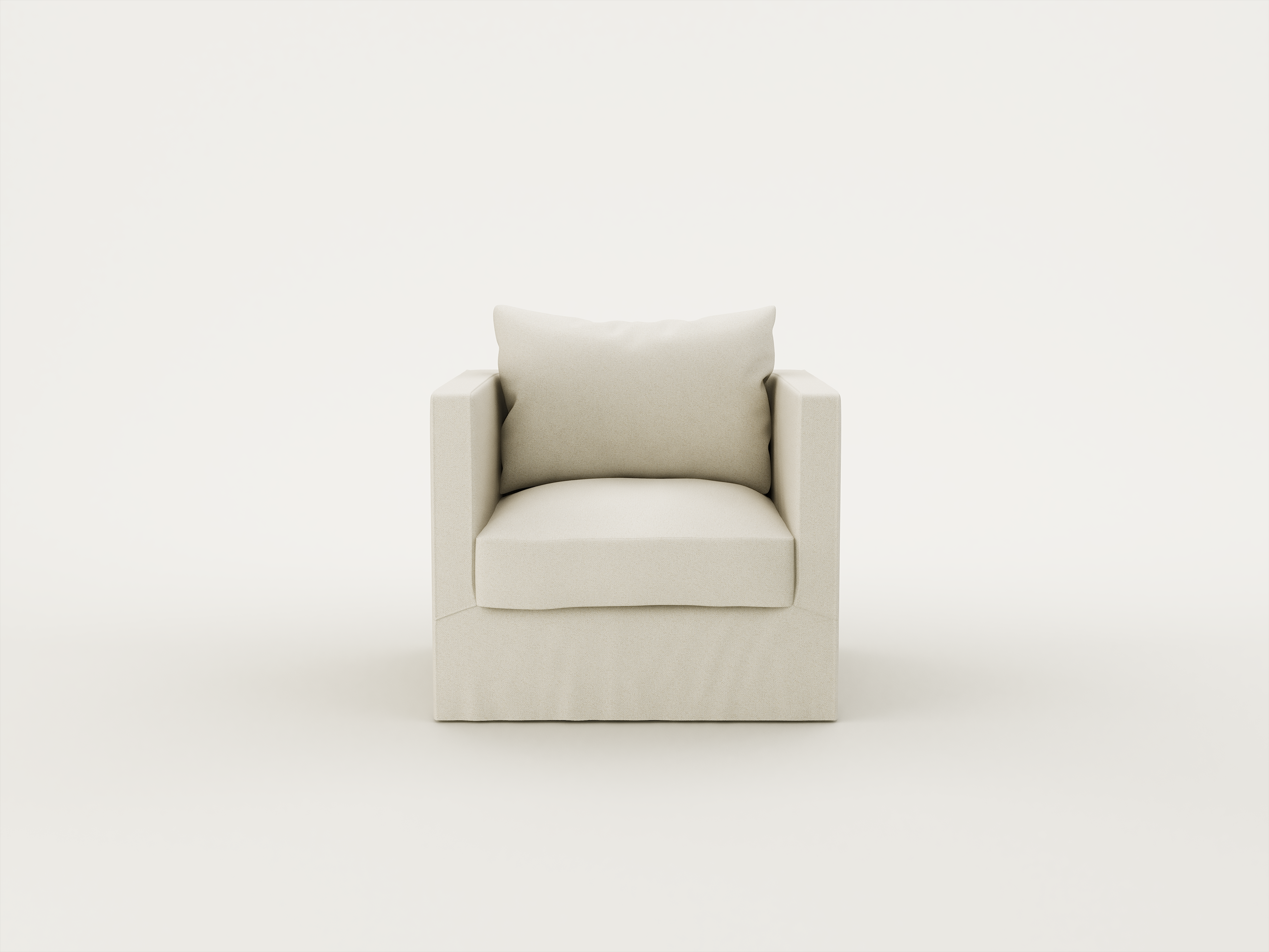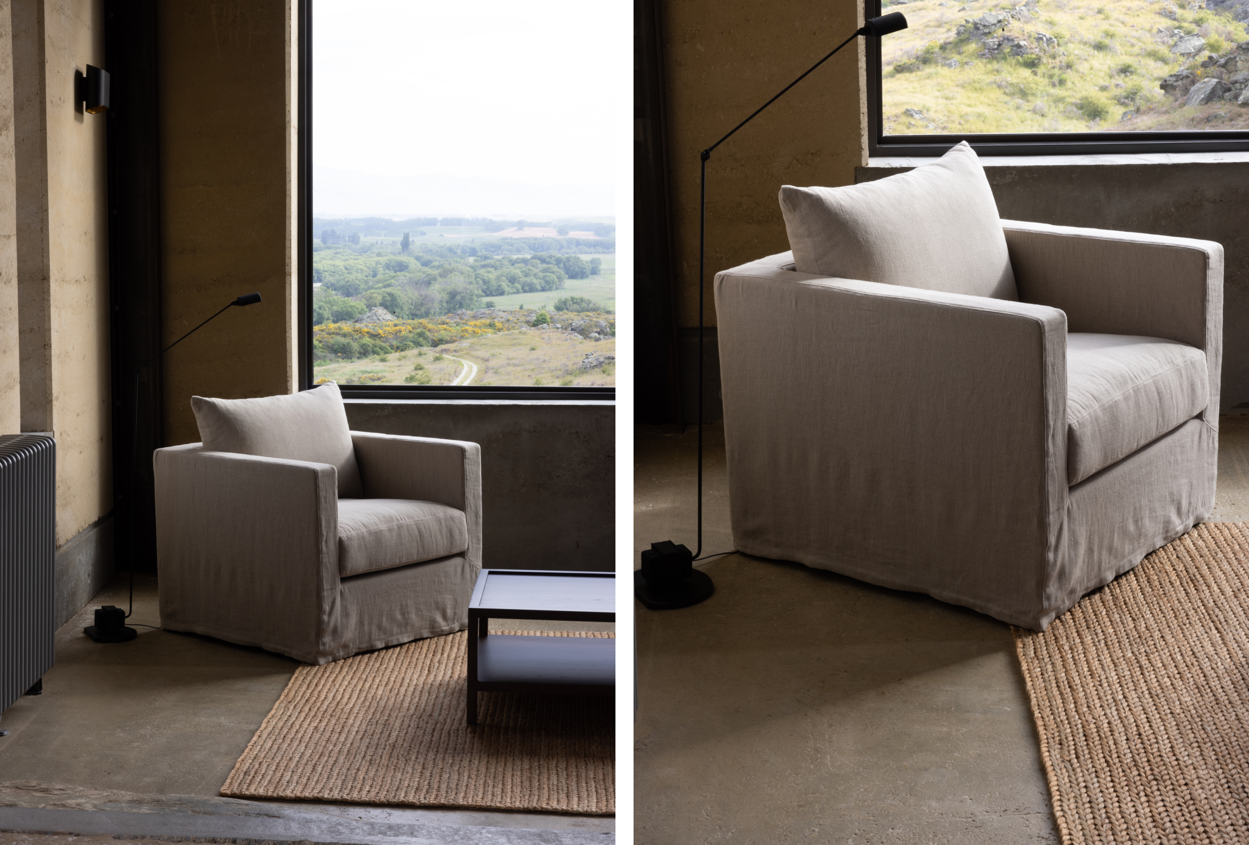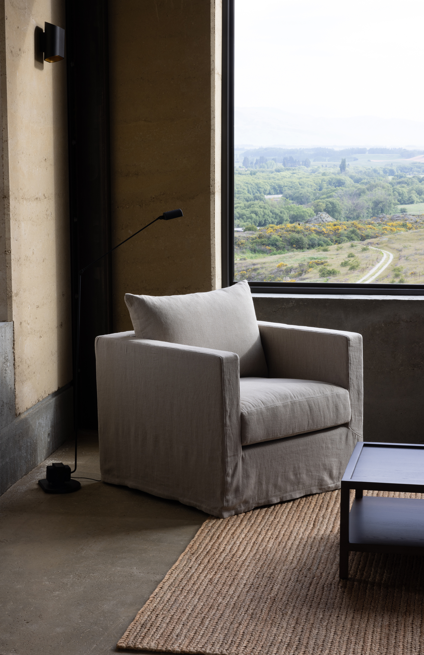 An inviting slipcover chair with a refined edge, characterised by a relaxed and generous form. A feather scatter cushion back and square upholstered arms are refined to find an ideal balance of comfort and support.