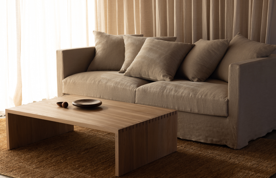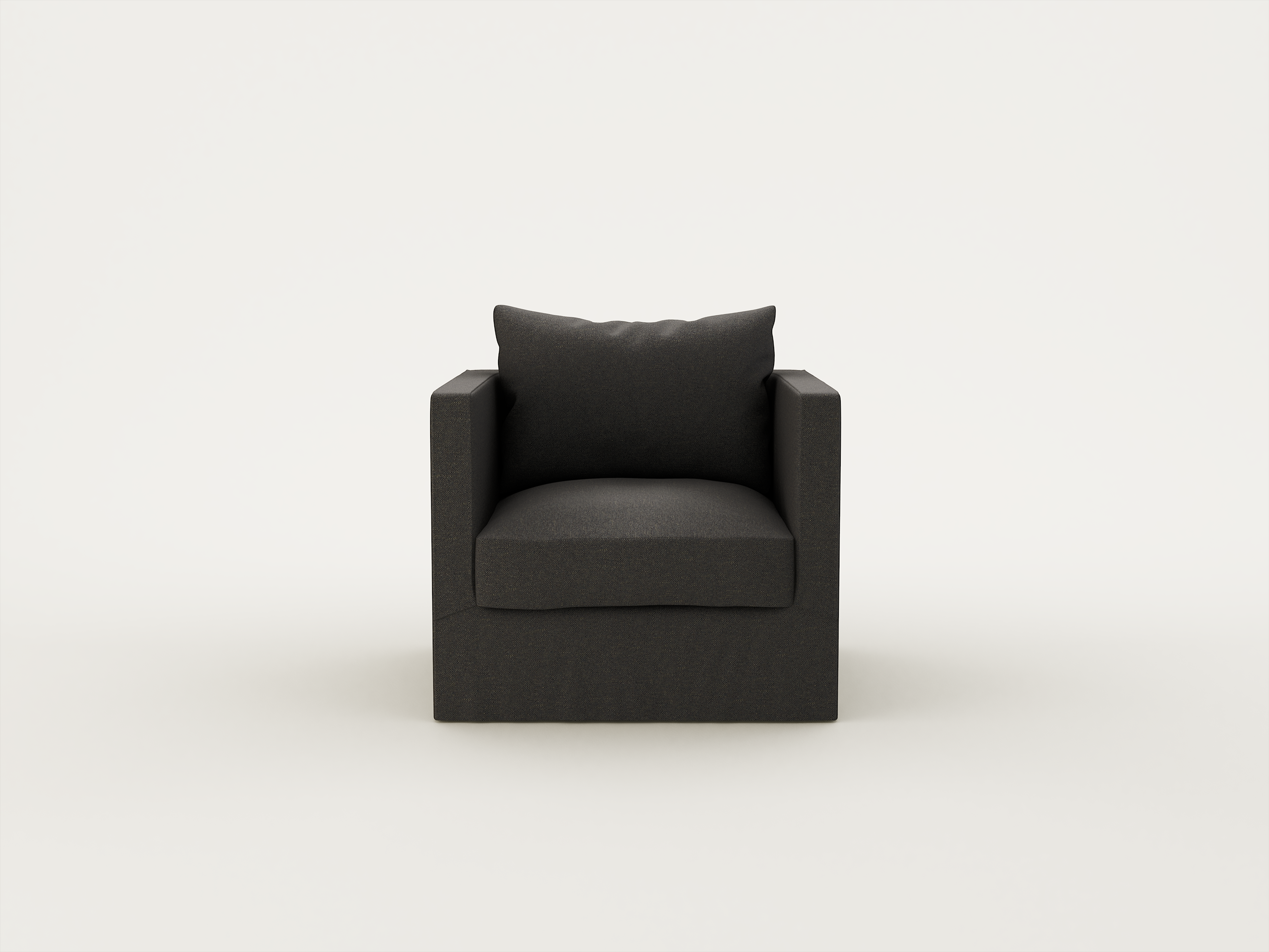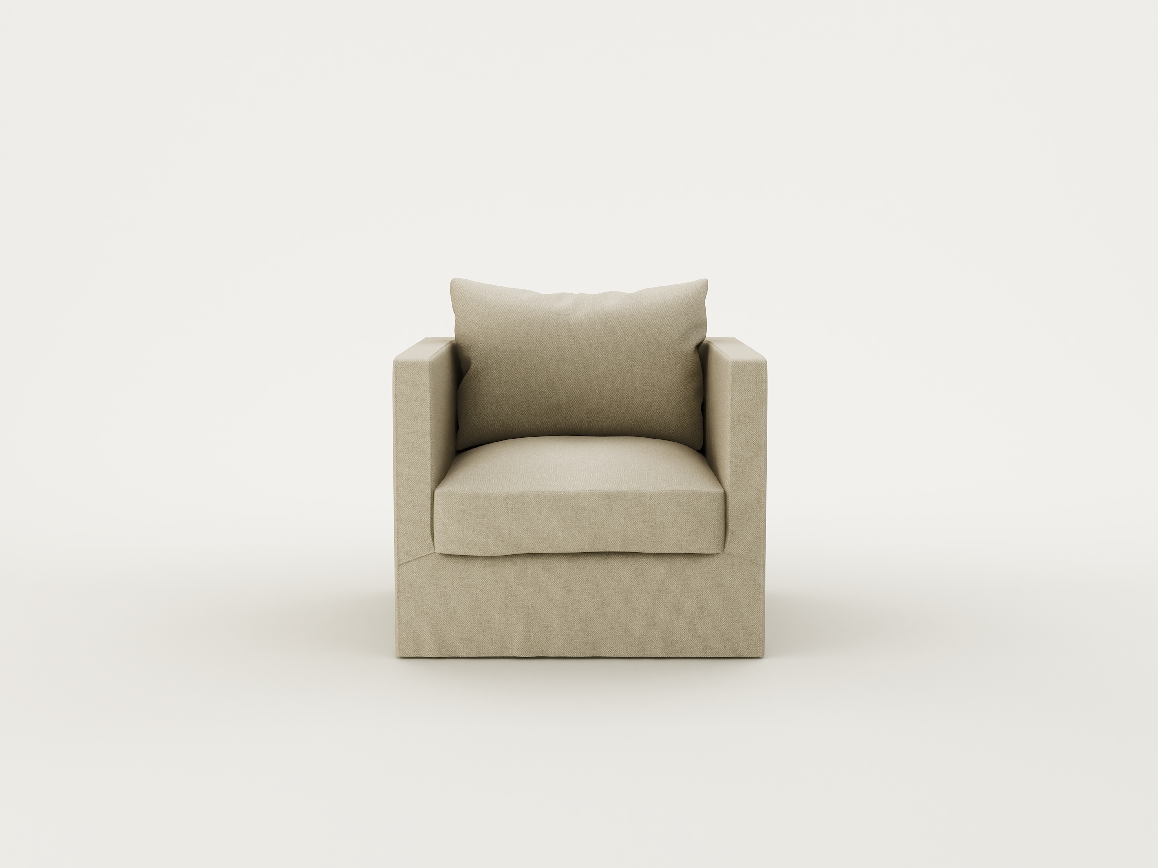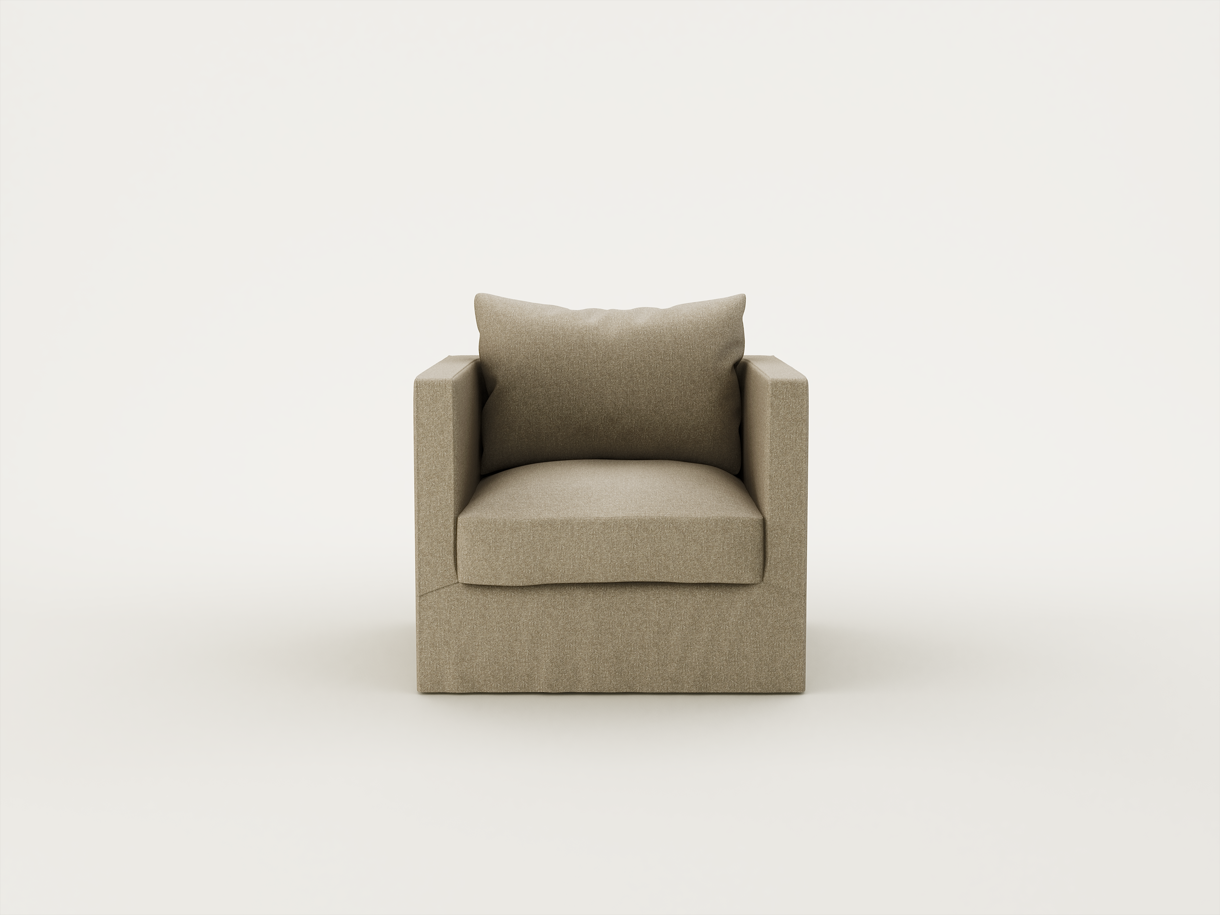 An inviting slipcover chair with a refined edge, characterised by a relaxed and generous form. A feather scatter cushion back and square upholstered arms are refined to find an ideal balance of comfort and support.
