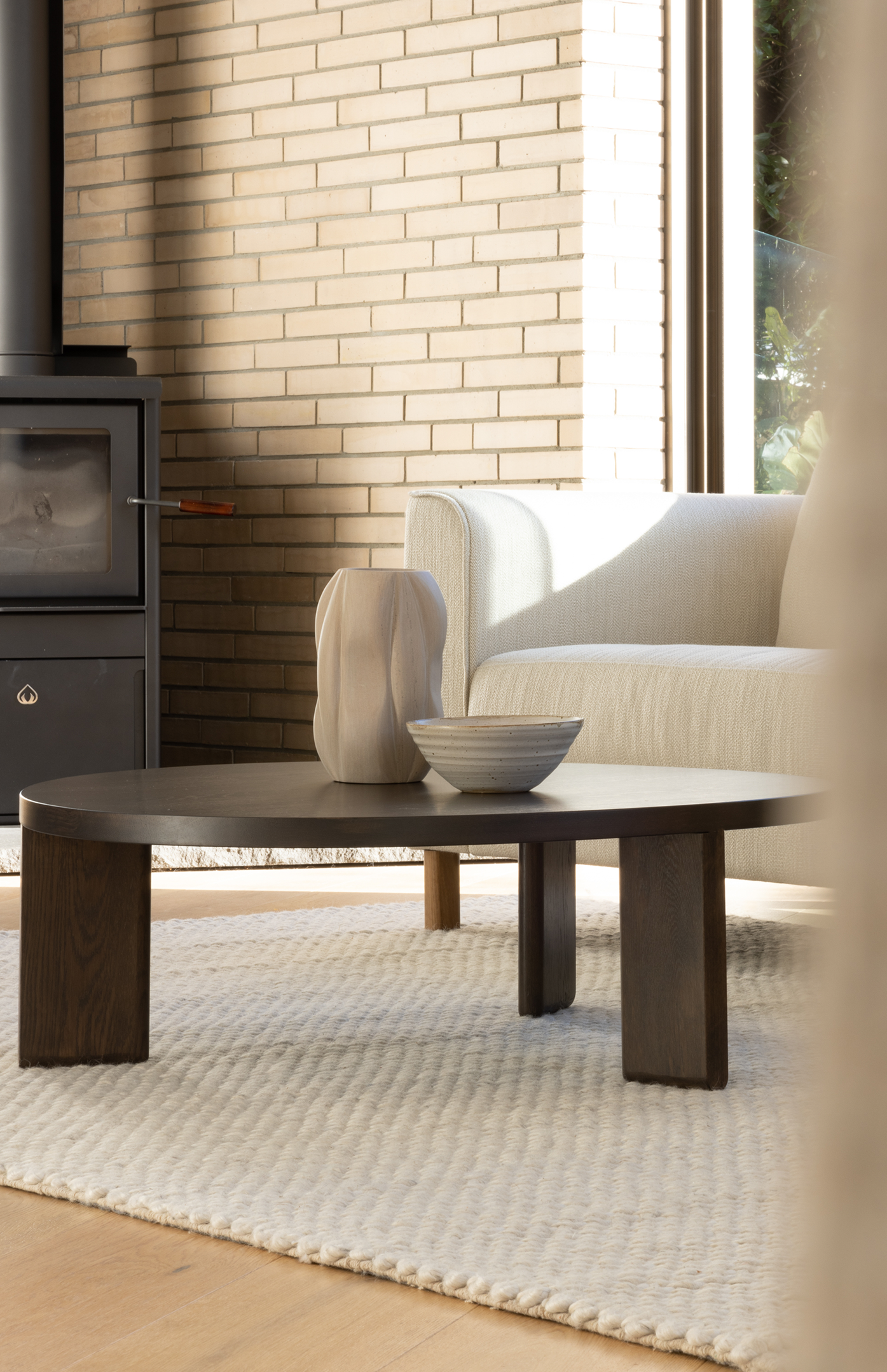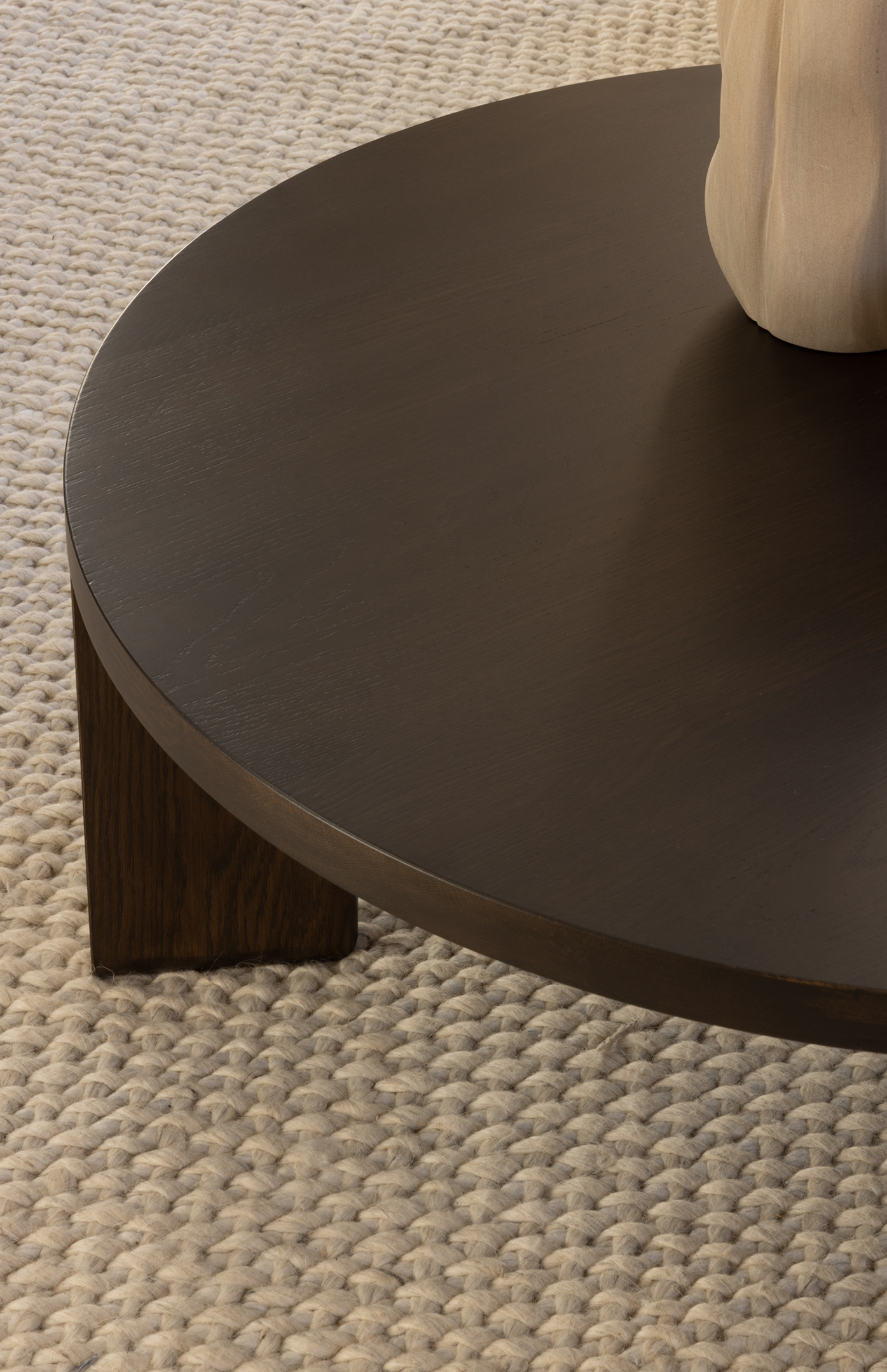 Characterised by a low, chunky circular form and three angled legs, Envoy is a modern coffee table. Each leg seamlessly integrates into the table, reinforced with metal pins for extra structural integrity.