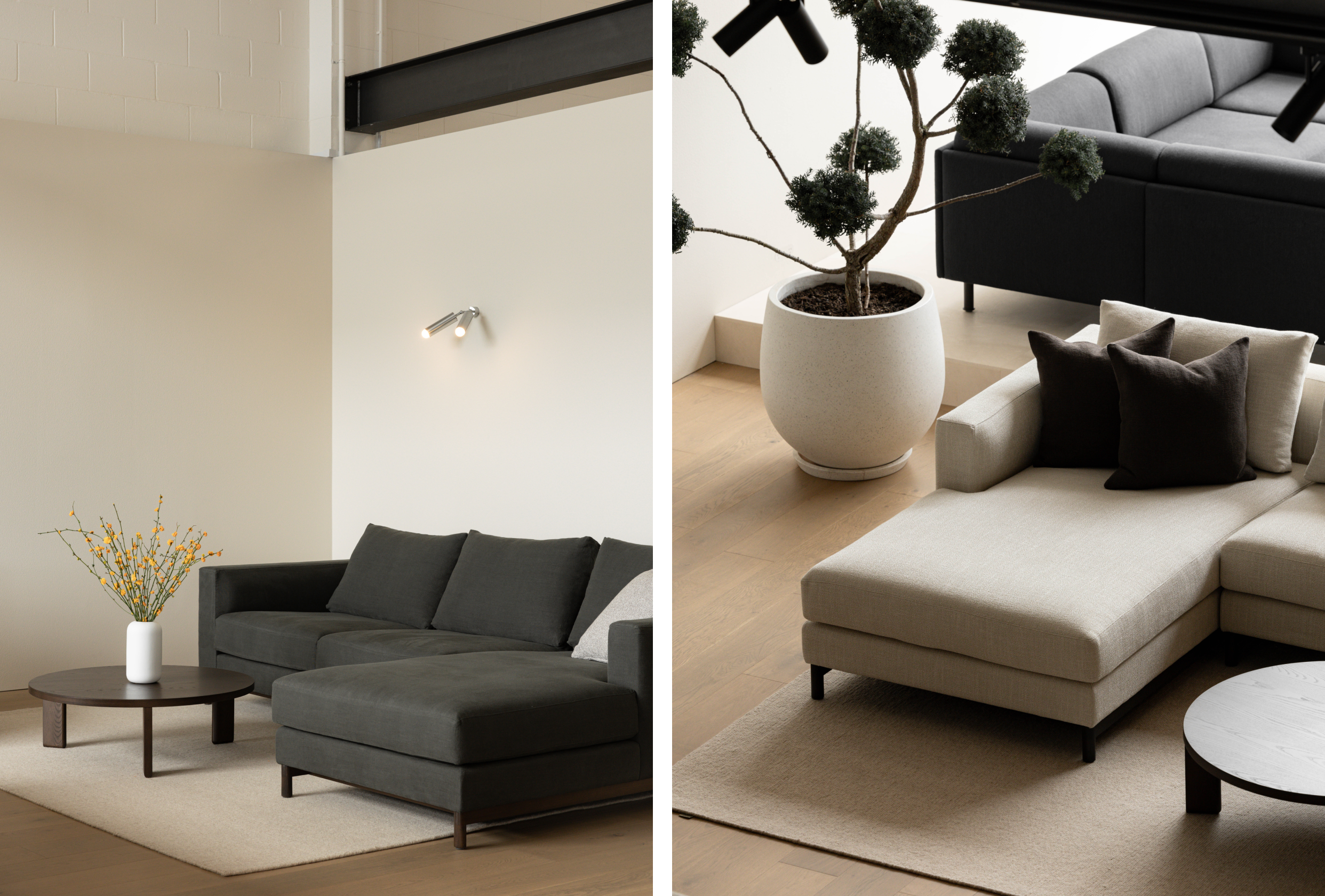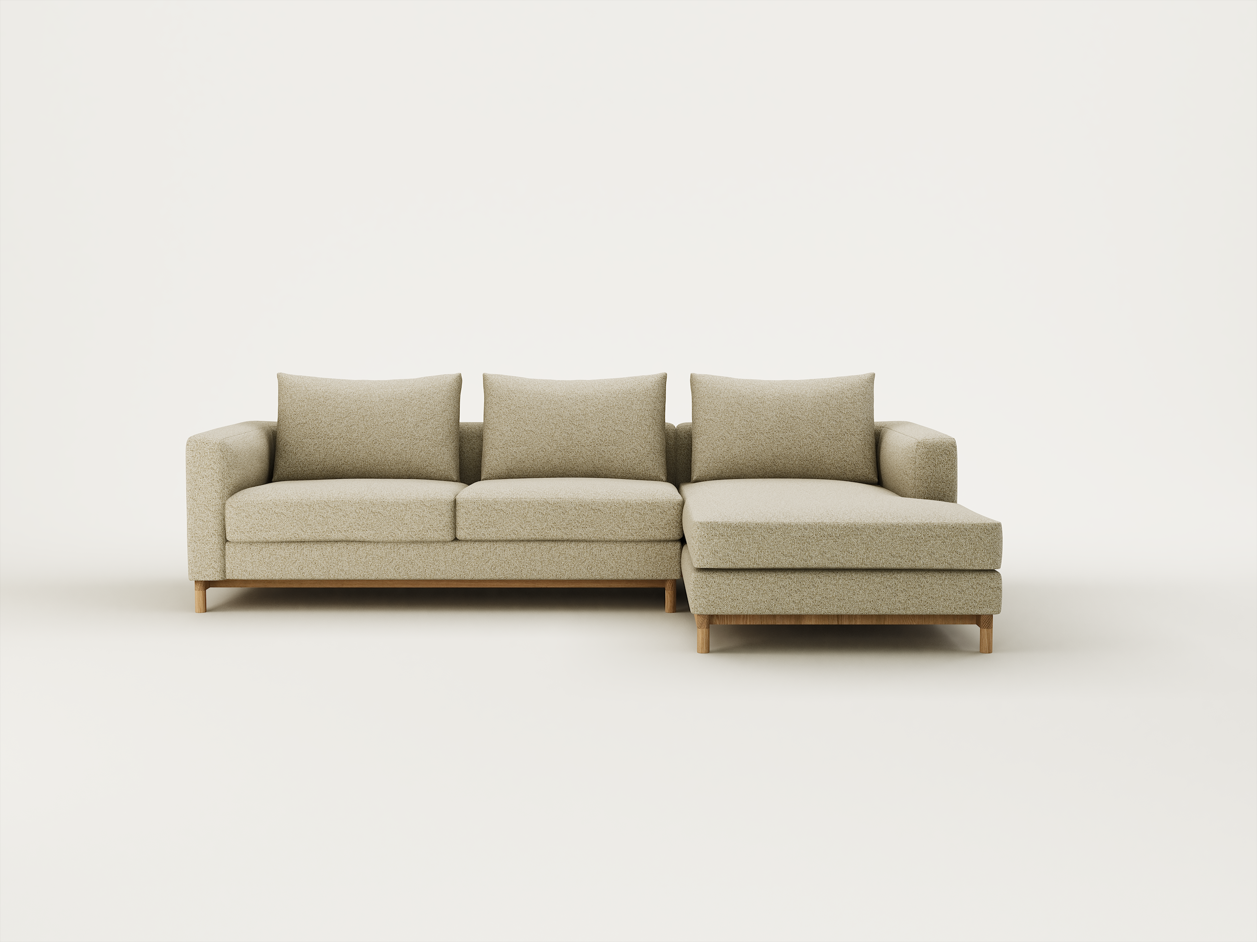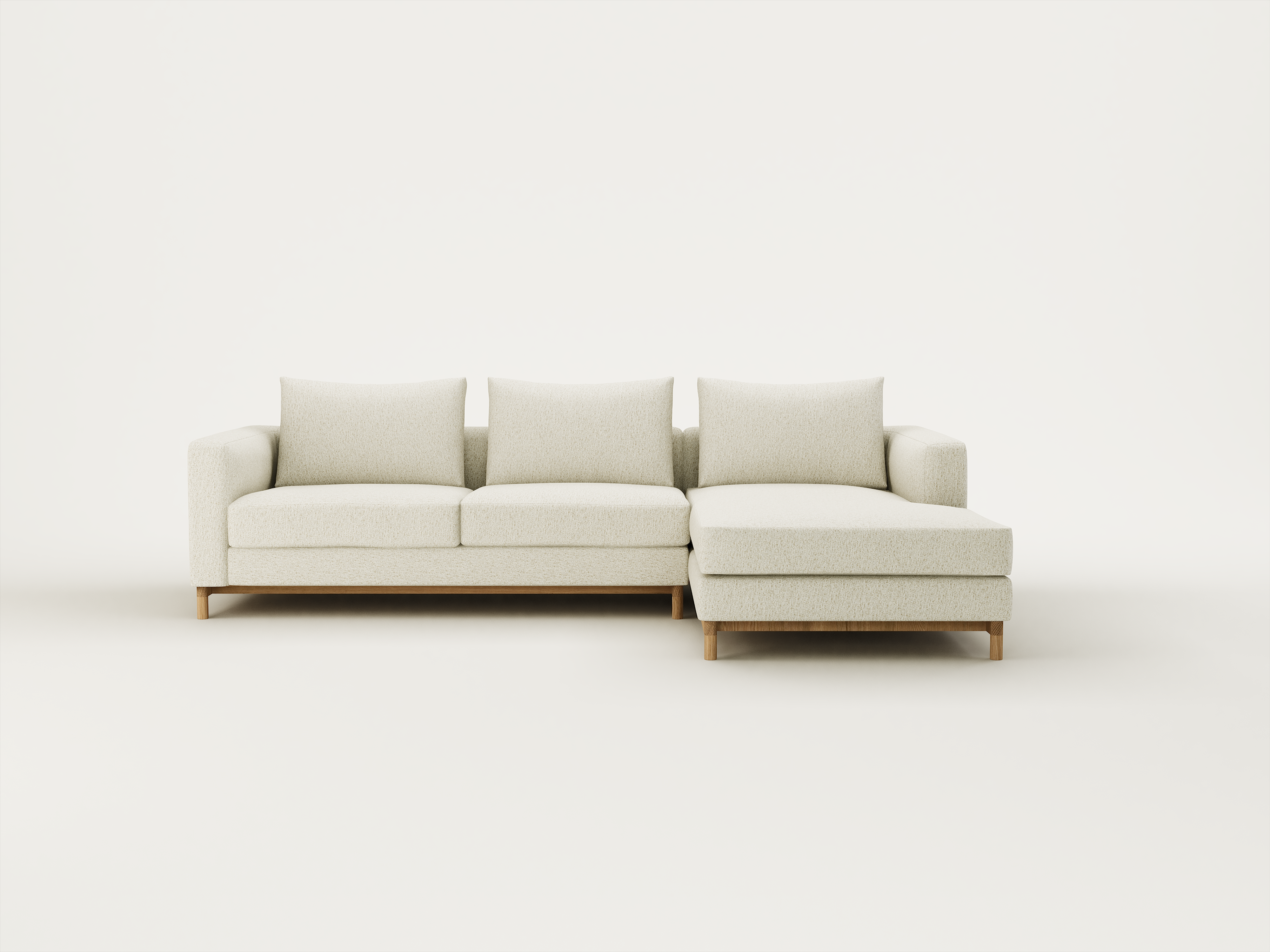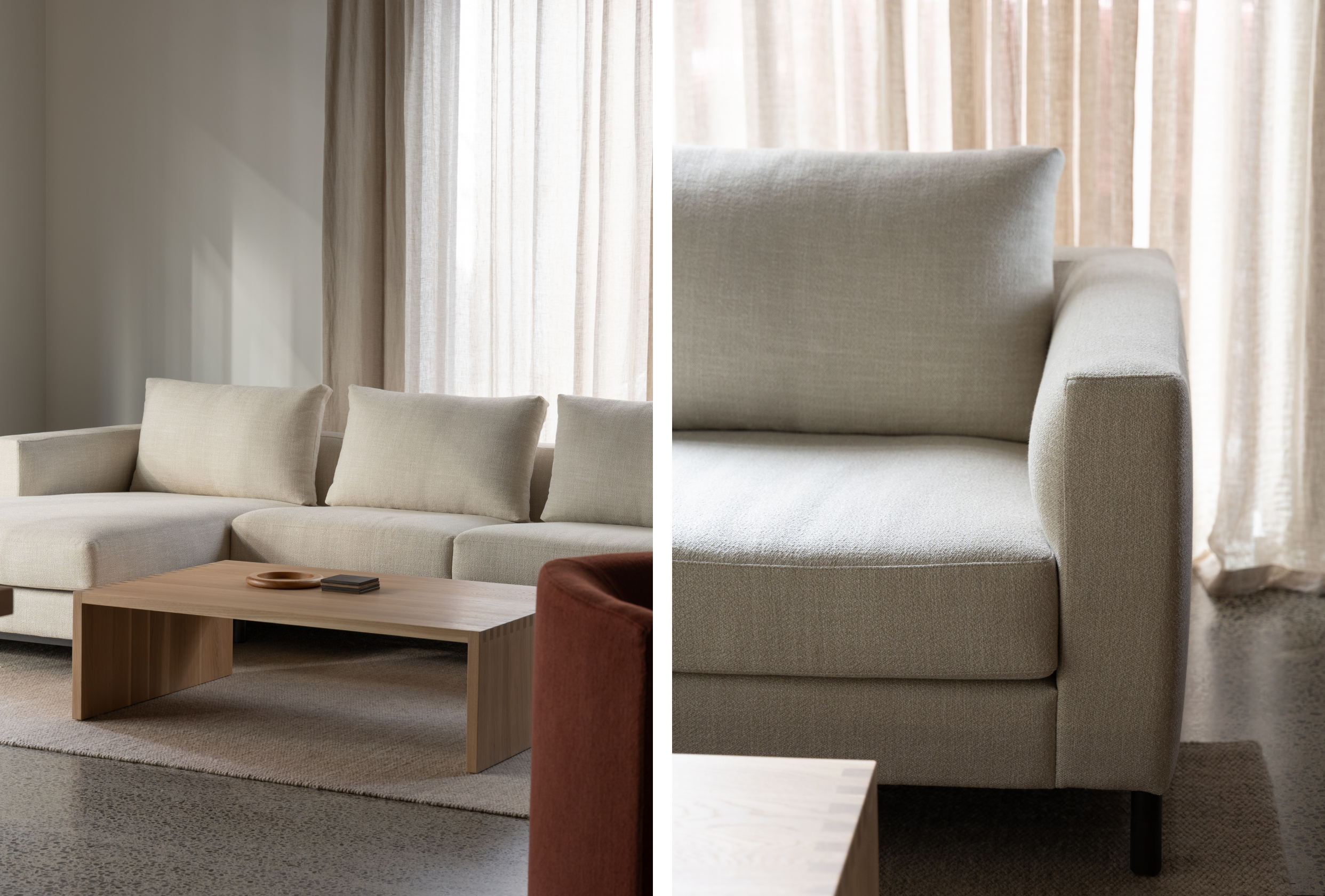 A simple, well-proportioned sofa, Fusion features loose seat and back cushions with a square upholstered surround. A subtle curve on the inner arm and a timber base with feature end grain detailing bring a softness to the form.