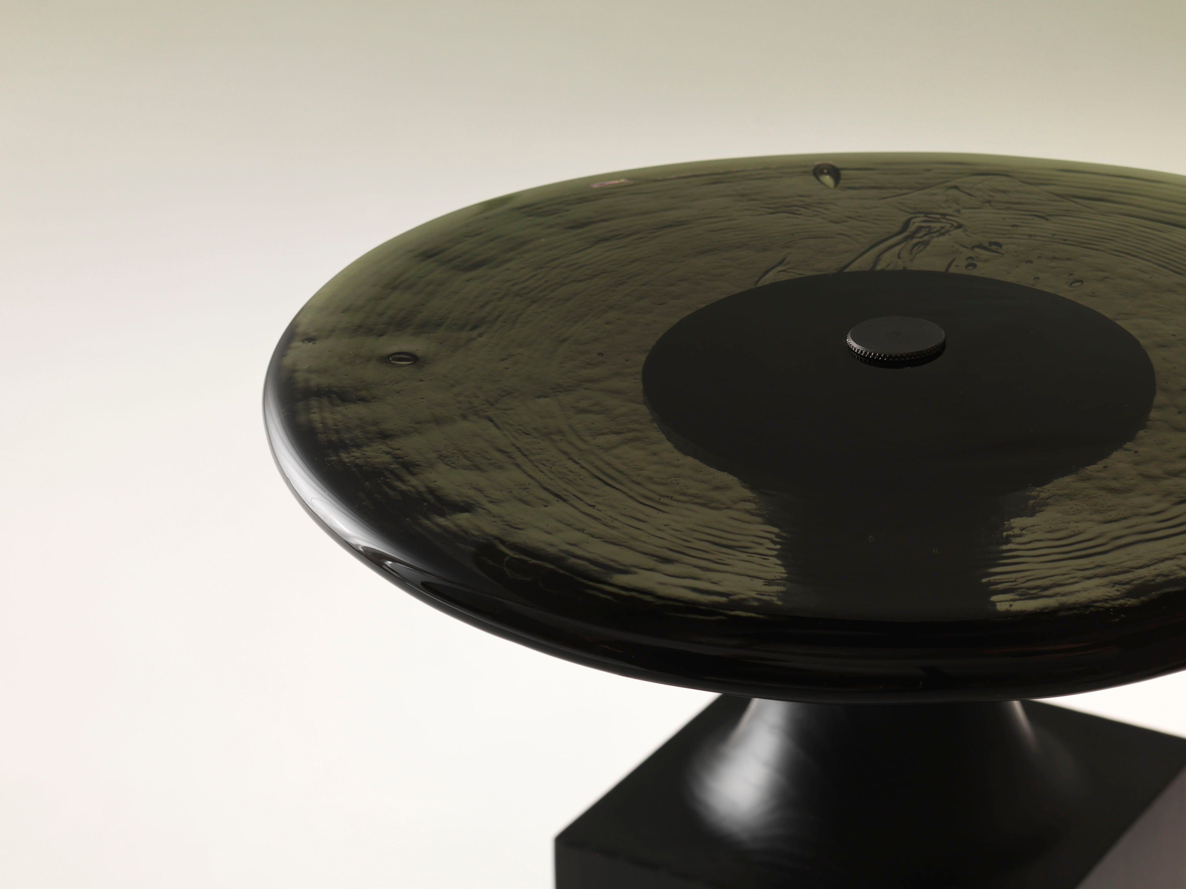 Angular, grounded and precise, Kiki is a side table with a deep and moody character. A dark, square base supports a hand-poured smokey, charcoal glass top, echoing the shifting depth and movement of water.