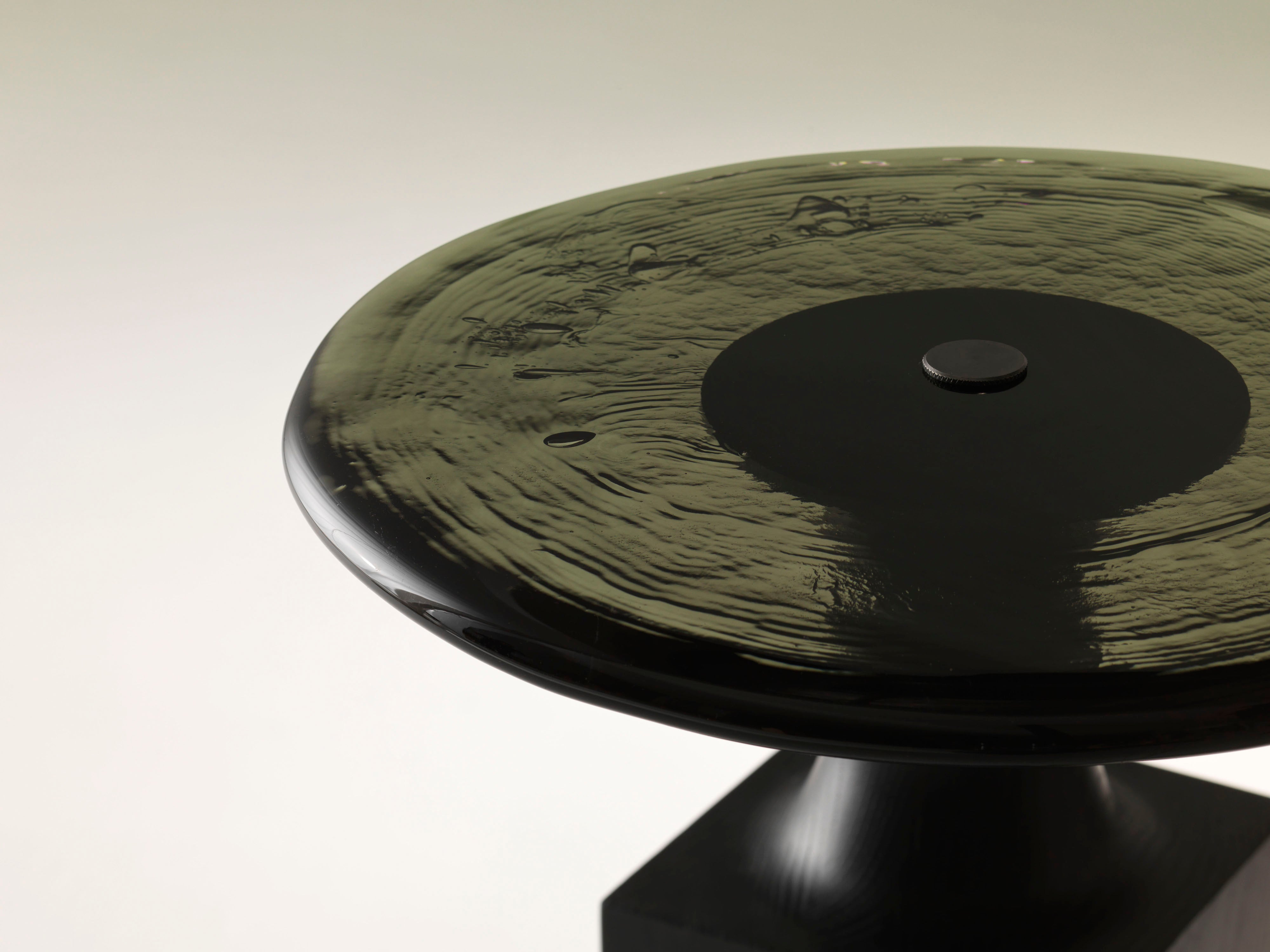 Angular, grounded and precise, Kiki is a side table with a deep and moody character. A dark, square base supports a hand-poured smokey, charcoal glass top, echoing the shifting depth and movement of water.