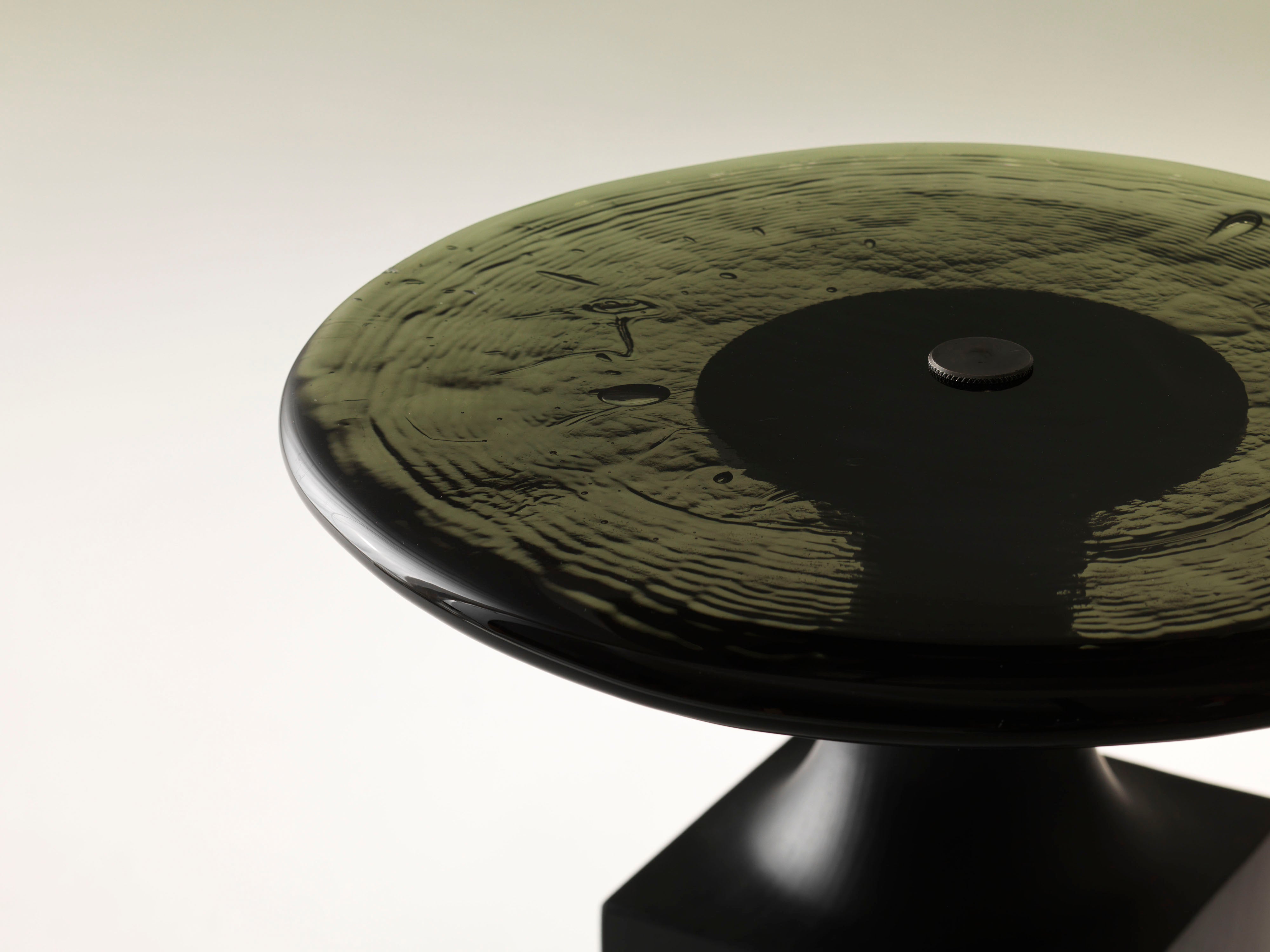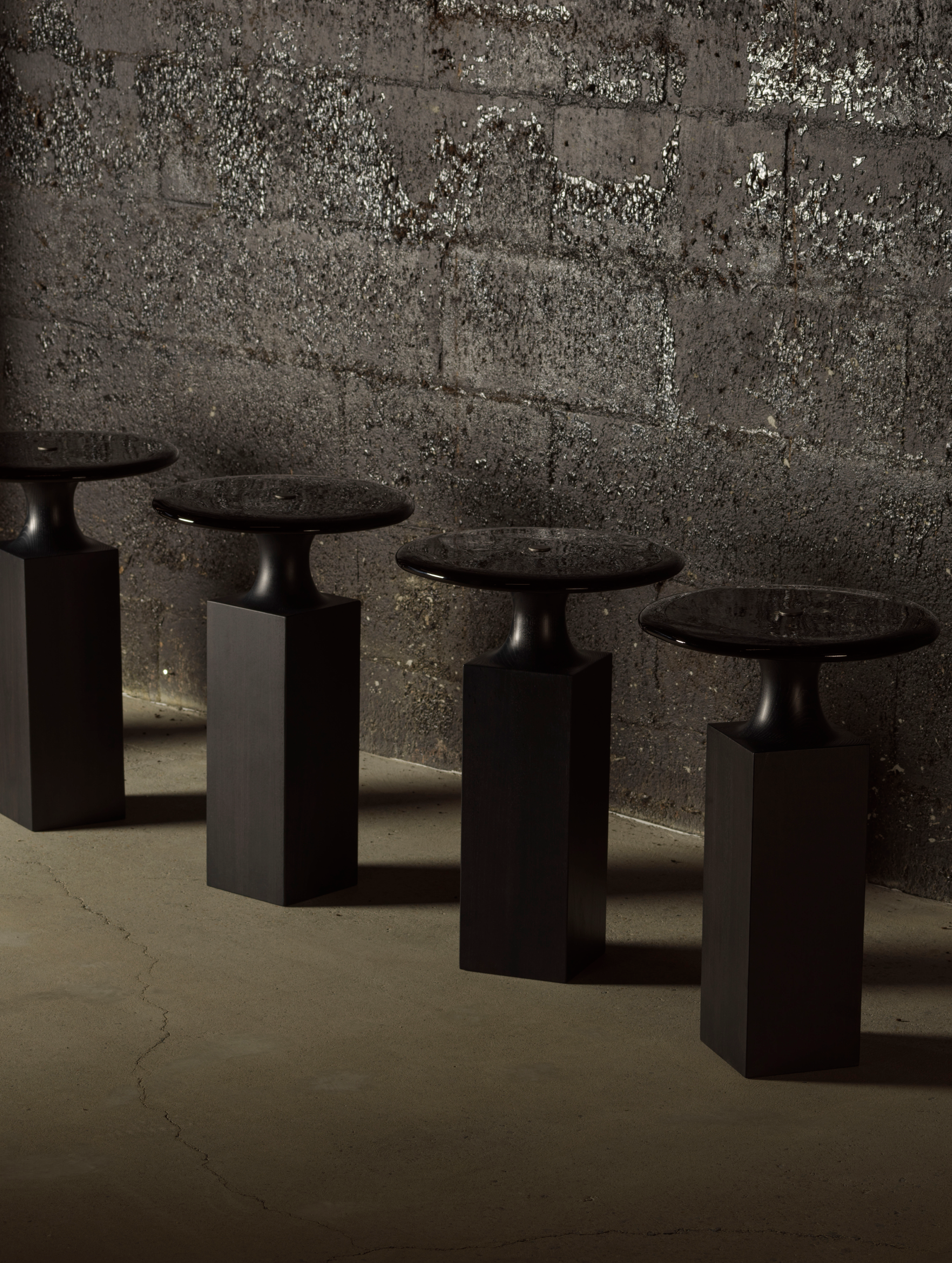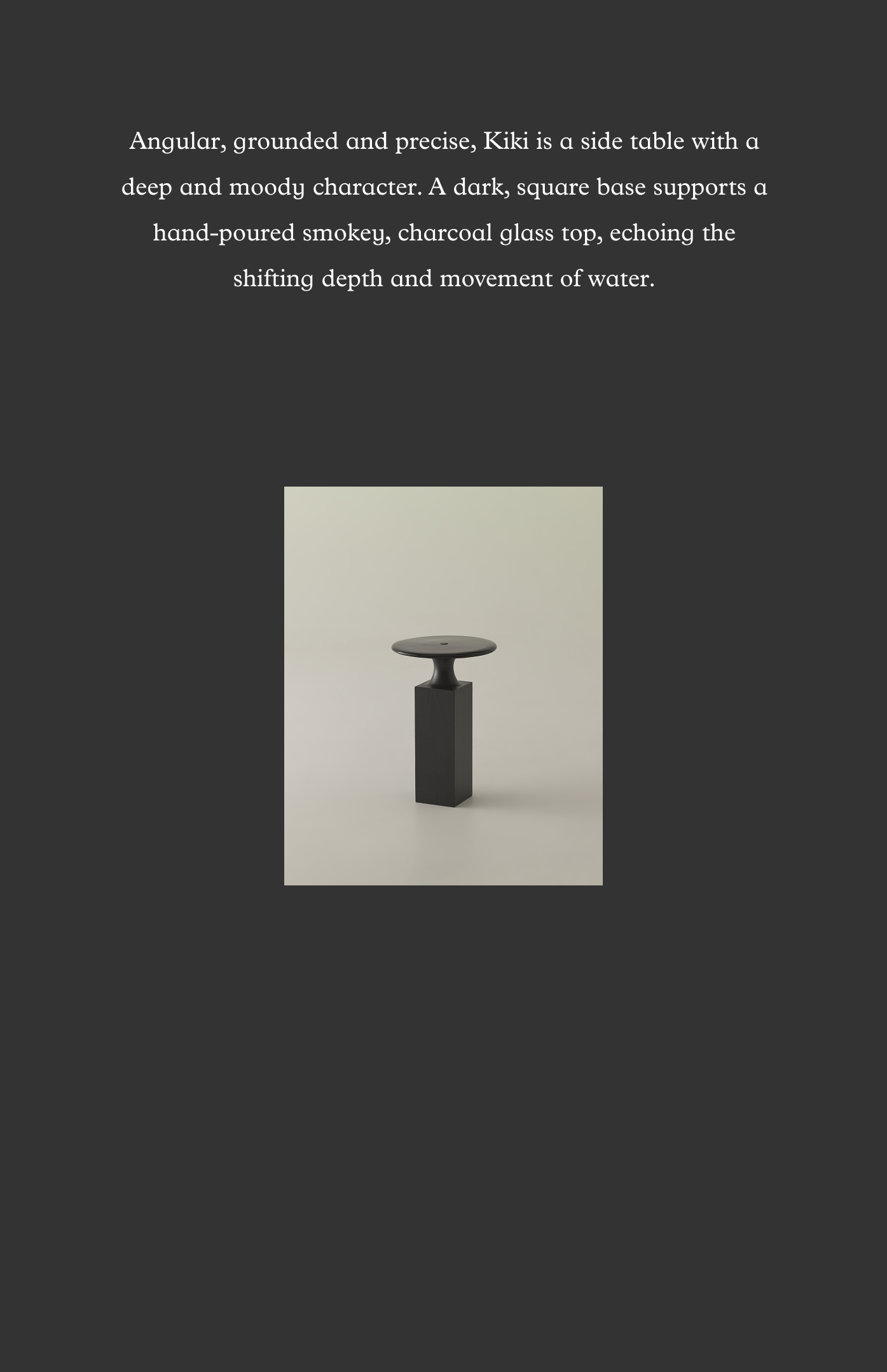 Angular, grounded and precise, Kiki is a side table with a deep and moody character. A dark, square base supports a hand-poured smokey, charcoal glass top, echoing the shifting depth and movement of water.