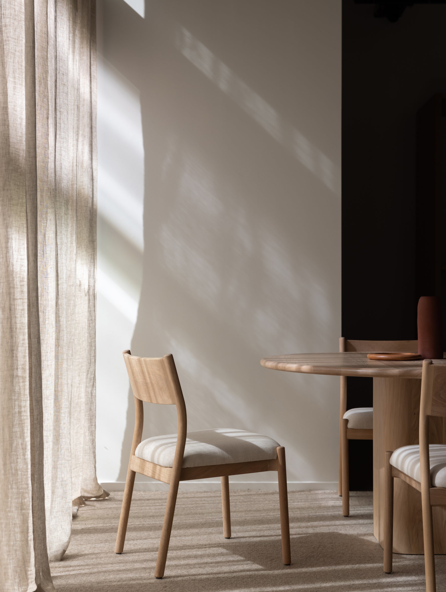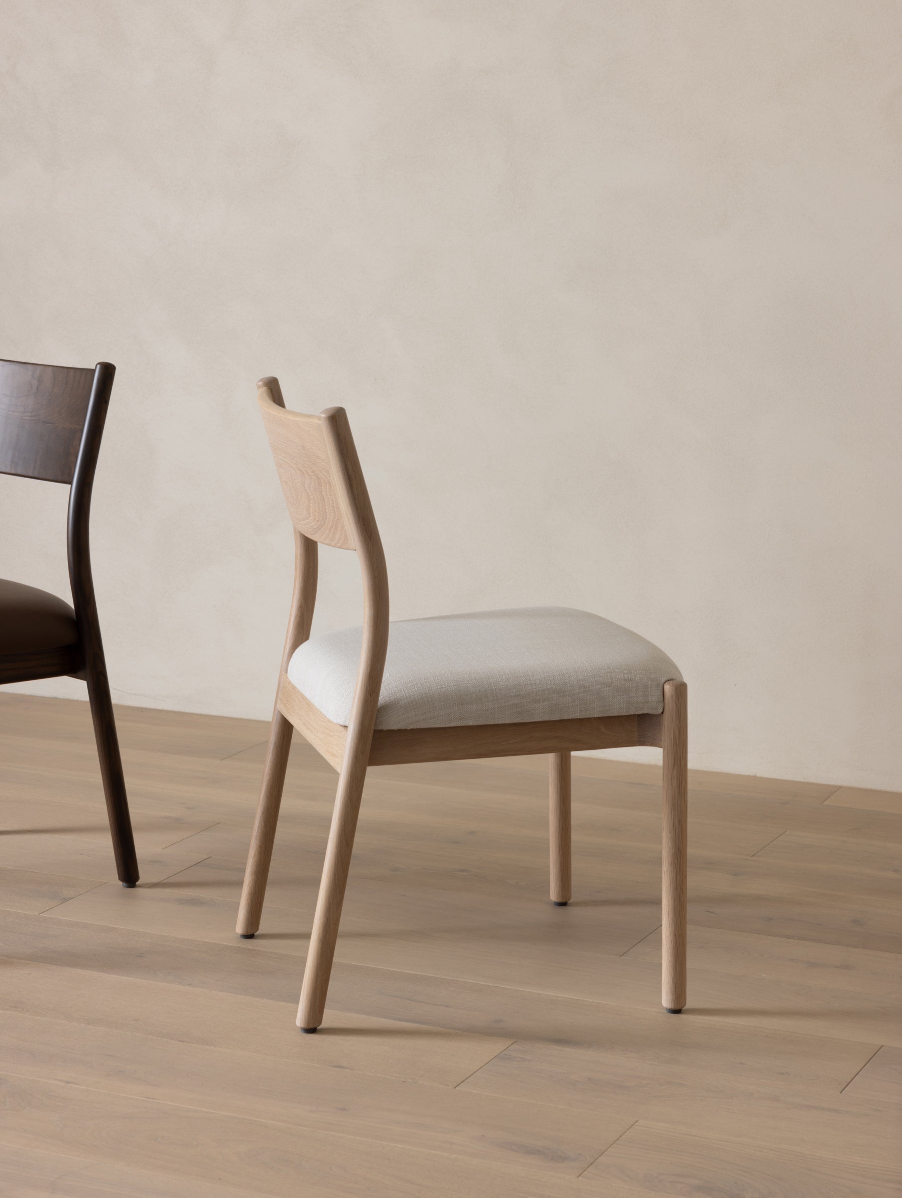 A refined and comfortable upholstered dining chair with a light dowel frame and contrasting generous timber back, blending elegance with practicality. An upholstered back provides additional comfort.
