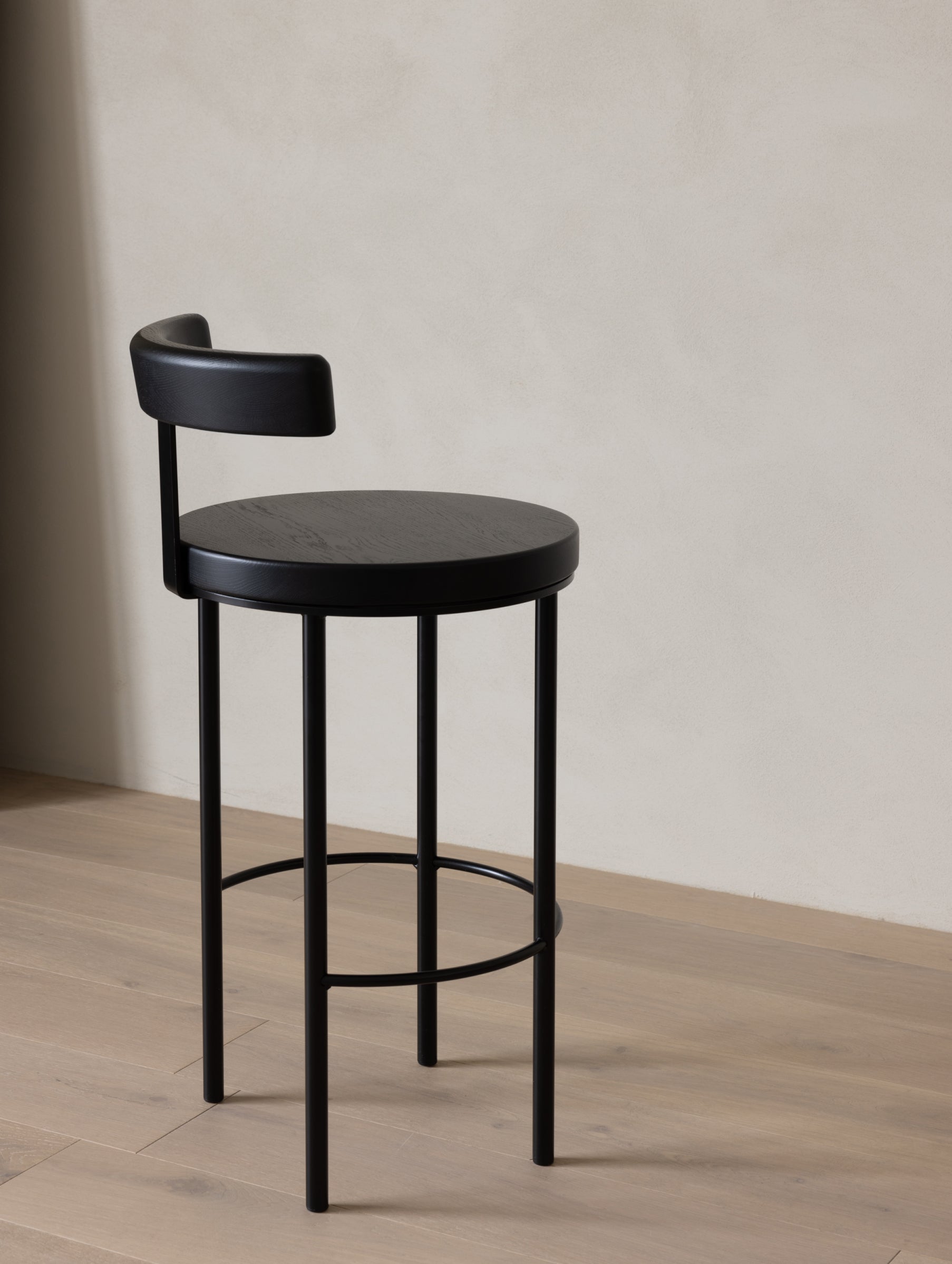 A mixed material bar stool with a powder coated frame, Ratio lends itself to a range of environments. Ratio can be tailored with a unique combination of metal, timber and upholstery.