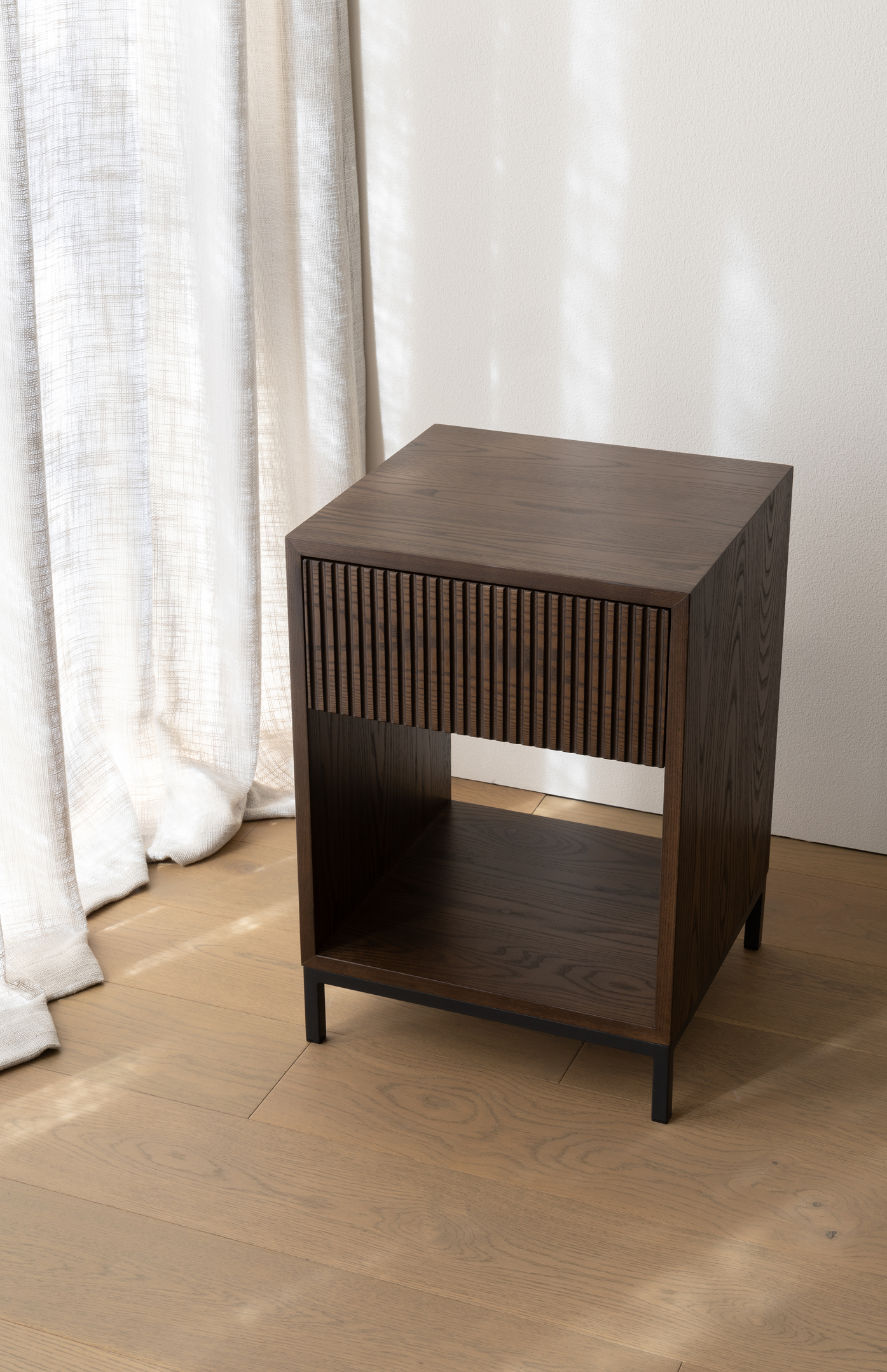 With a refined linear texture, Remi features fluted drawer fronts set on a low base with slim metal legs. A one drawer bedside designed for bedroom spaces.