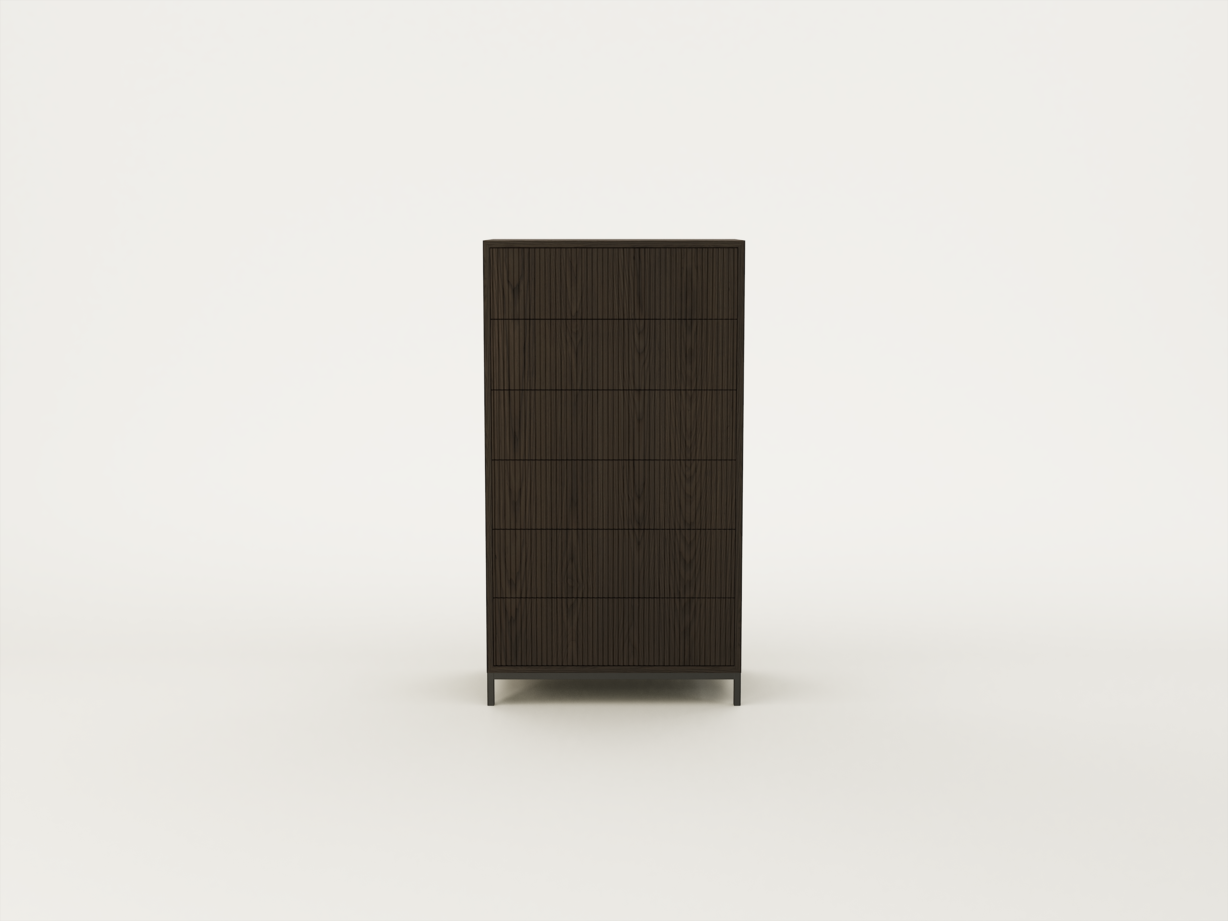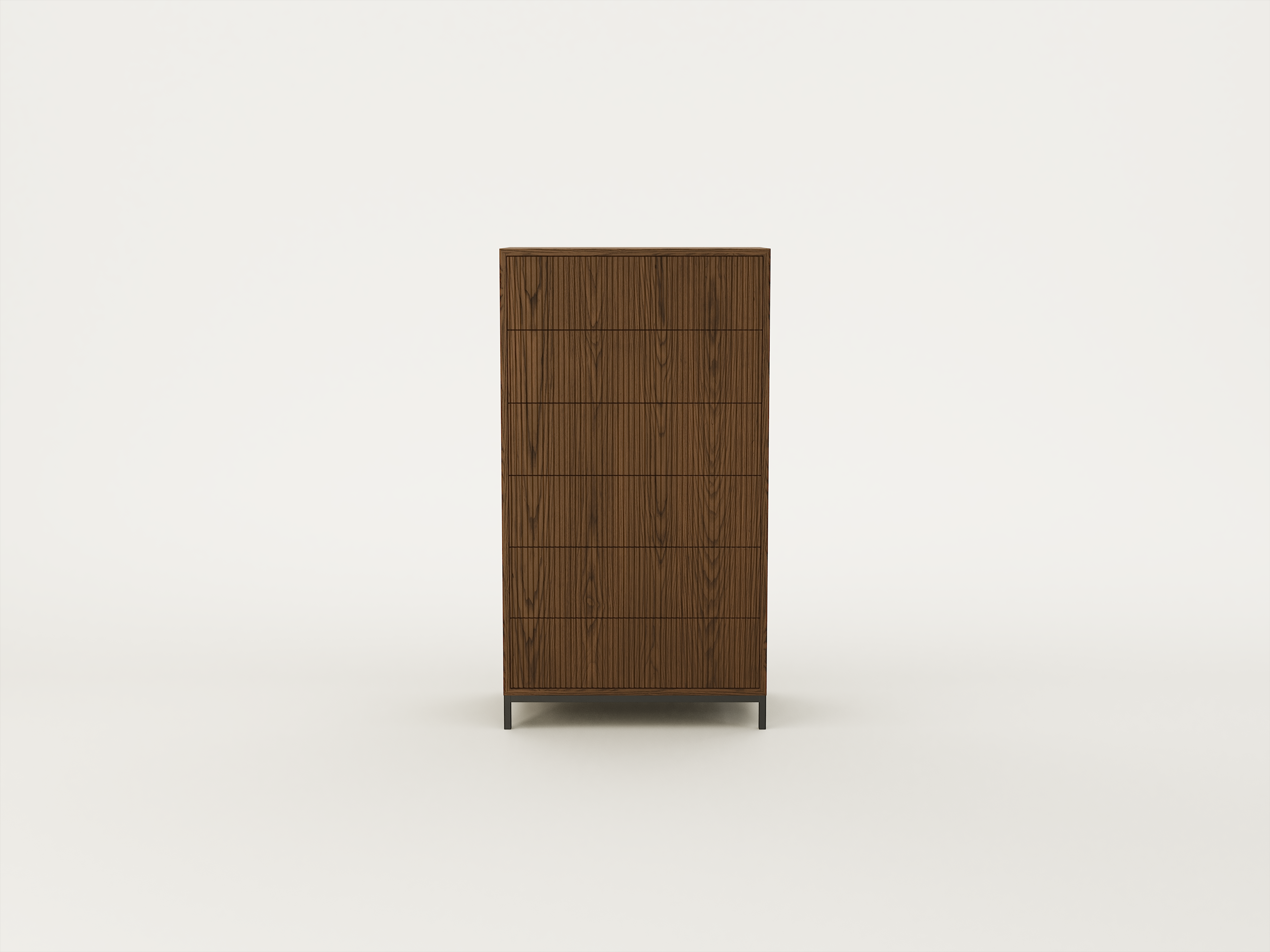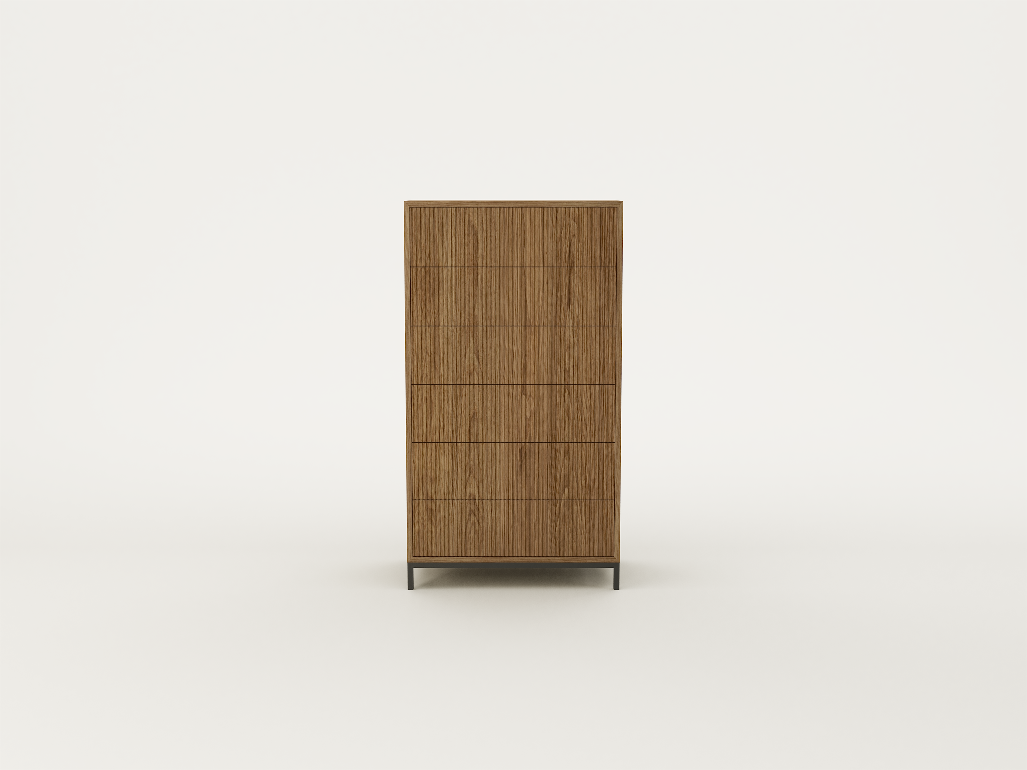 With a refined linear texture, Remi features fluted drawer fronts set on a low base with slim metal legs. A spacious, six drawer towerboy designed for bedroom spaces.
