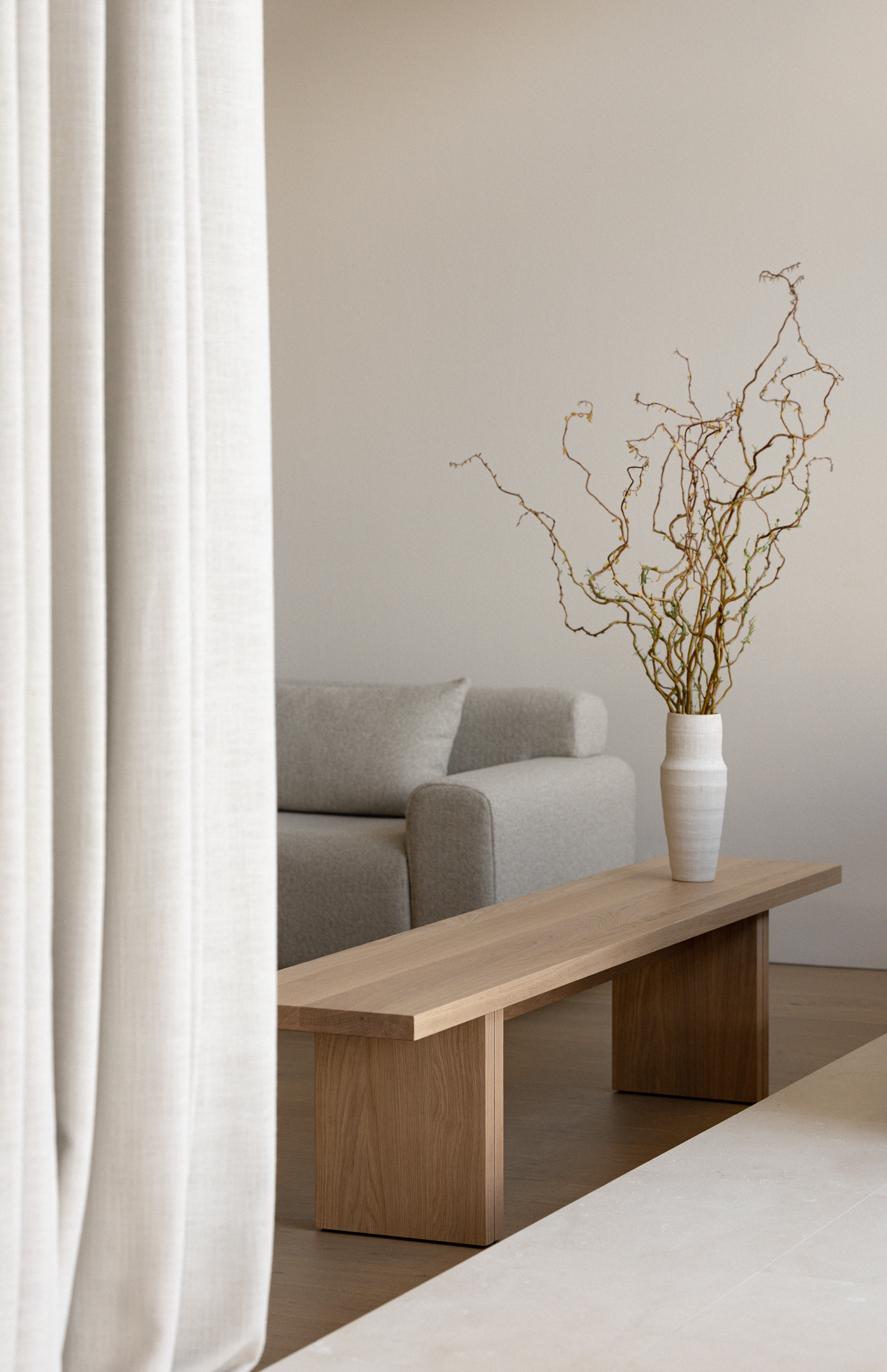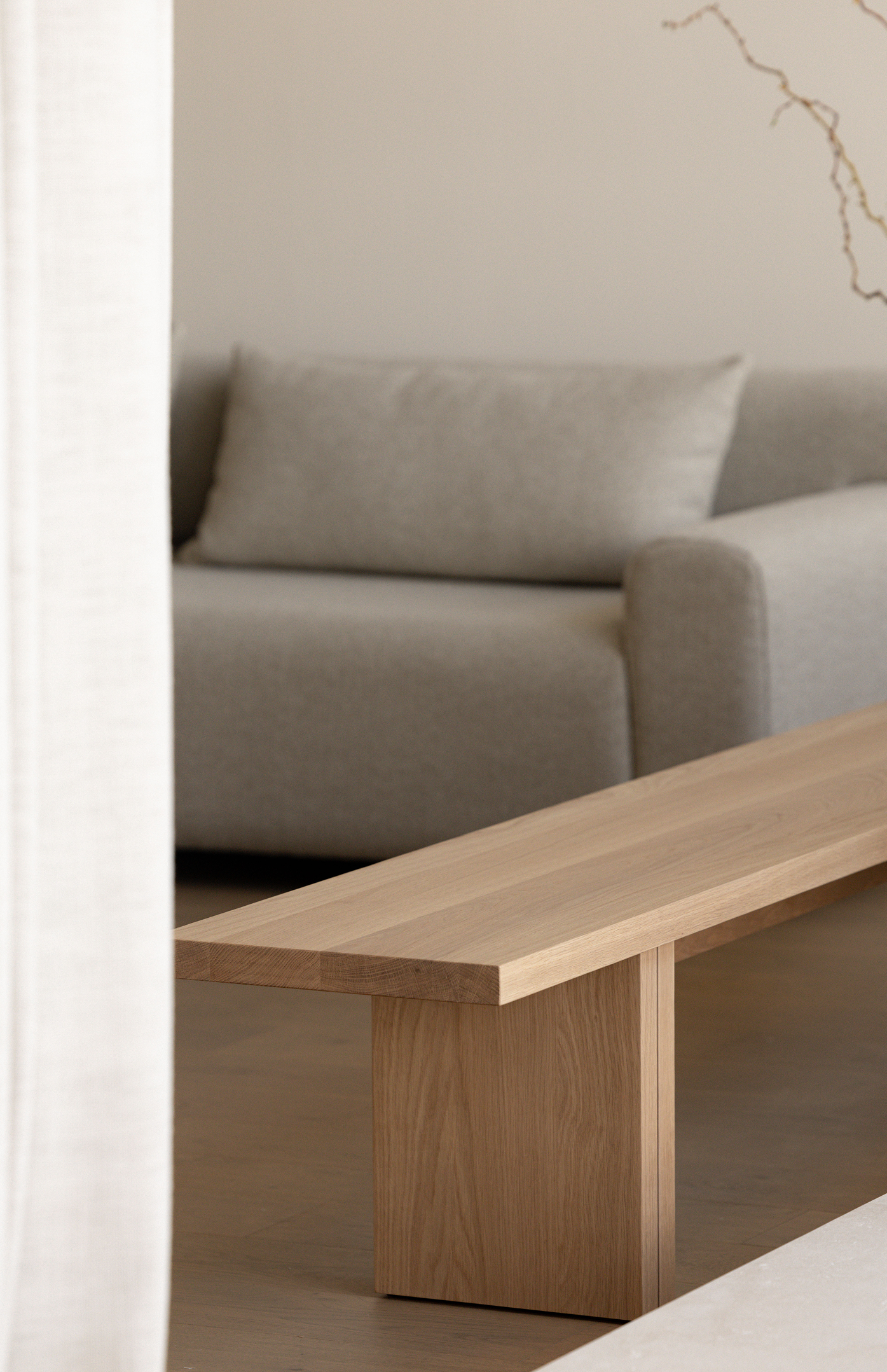 A tactile bench seat composed of solid timber slabs, defined by a negative detail running through the centre of the top and legs. An optional upholstered squab introduces softness, comfort, and material contrast.