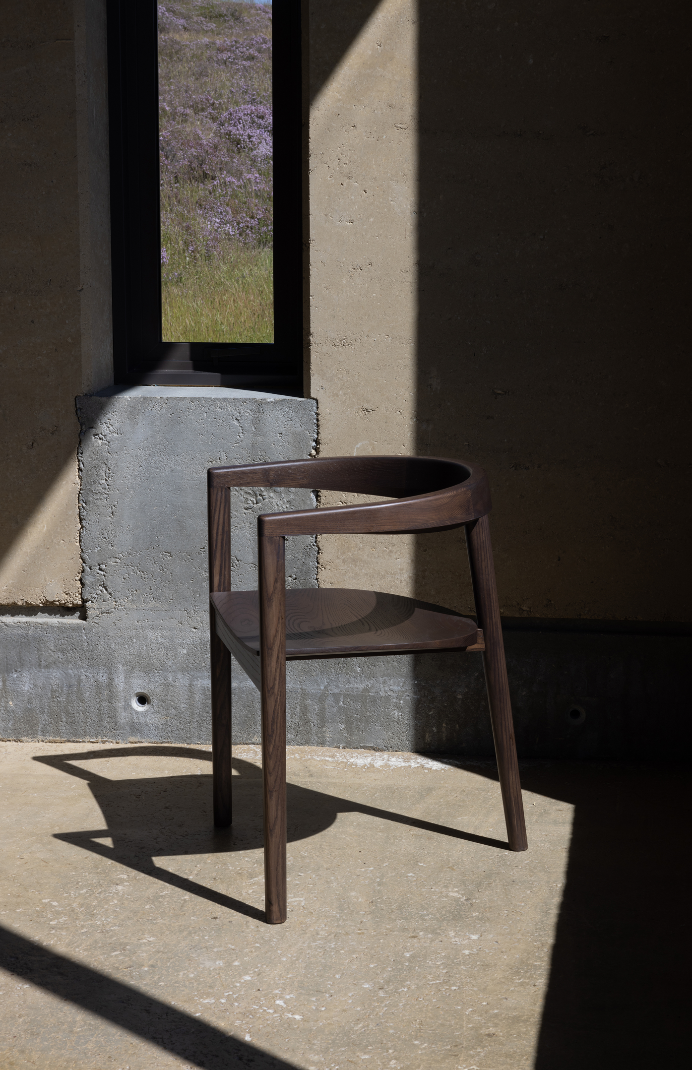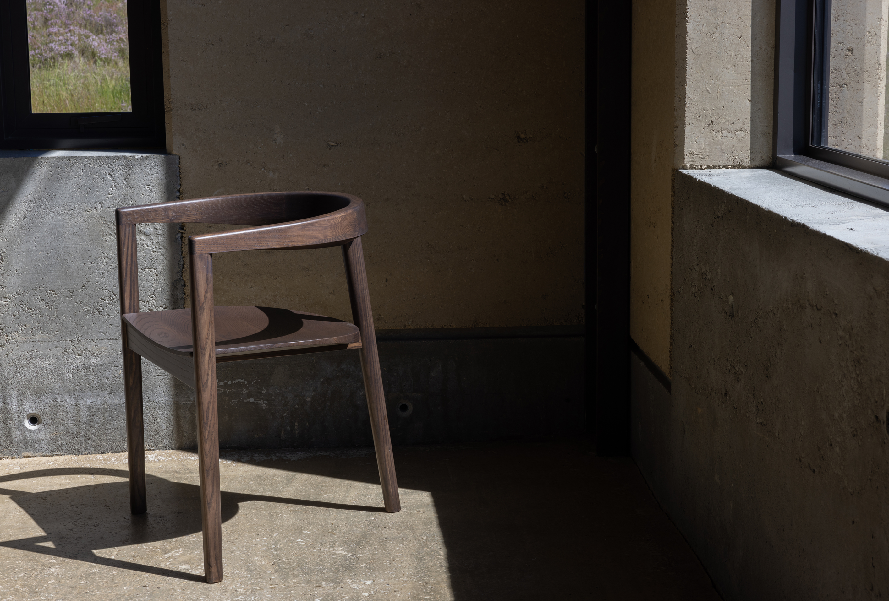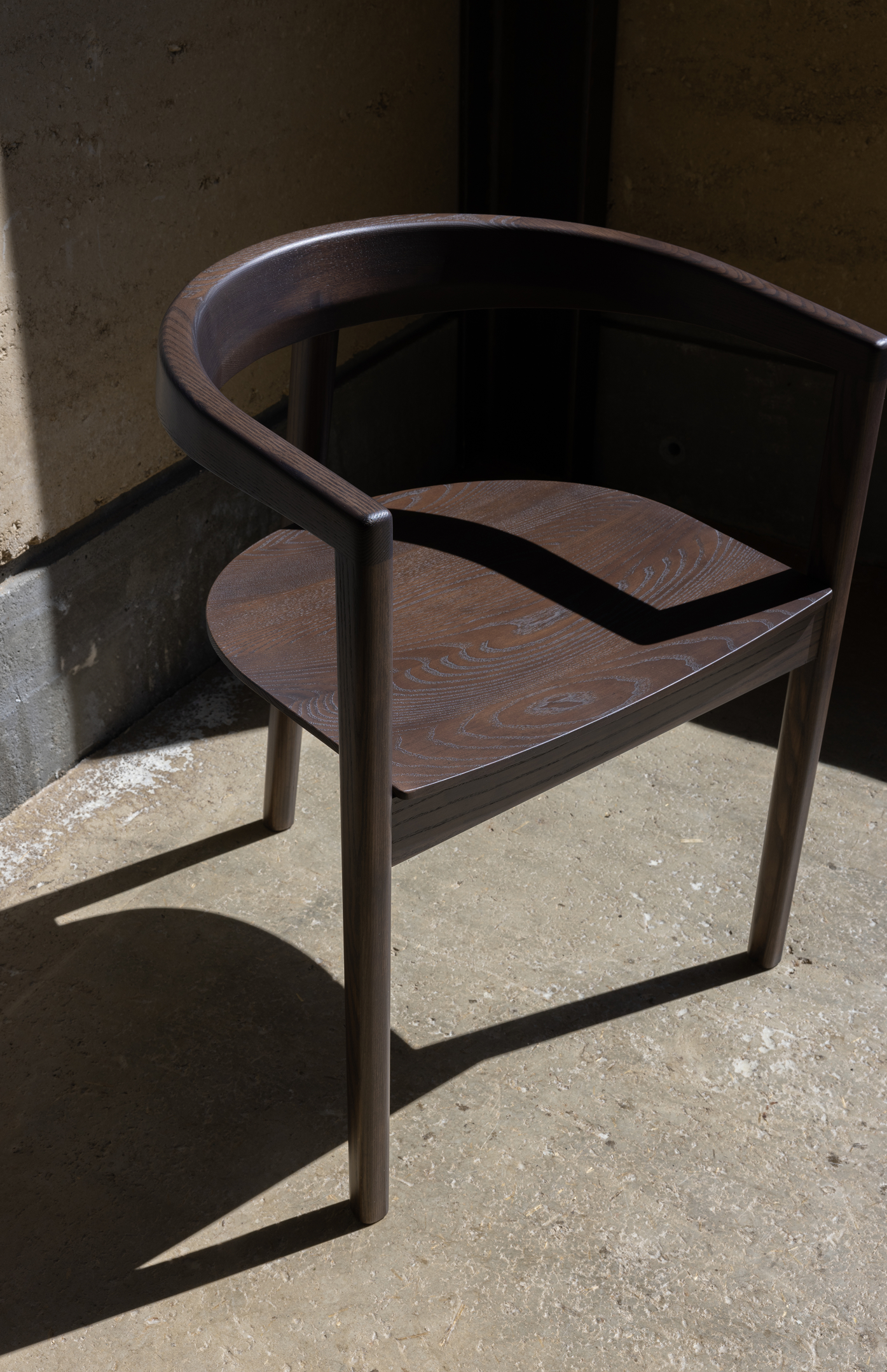A three-legged chair, SBR C01 blends considered details and proportions. Scalloped detailing around the back rest and tapered legs provide visual balance, while a contoured seat offers refined comfort.