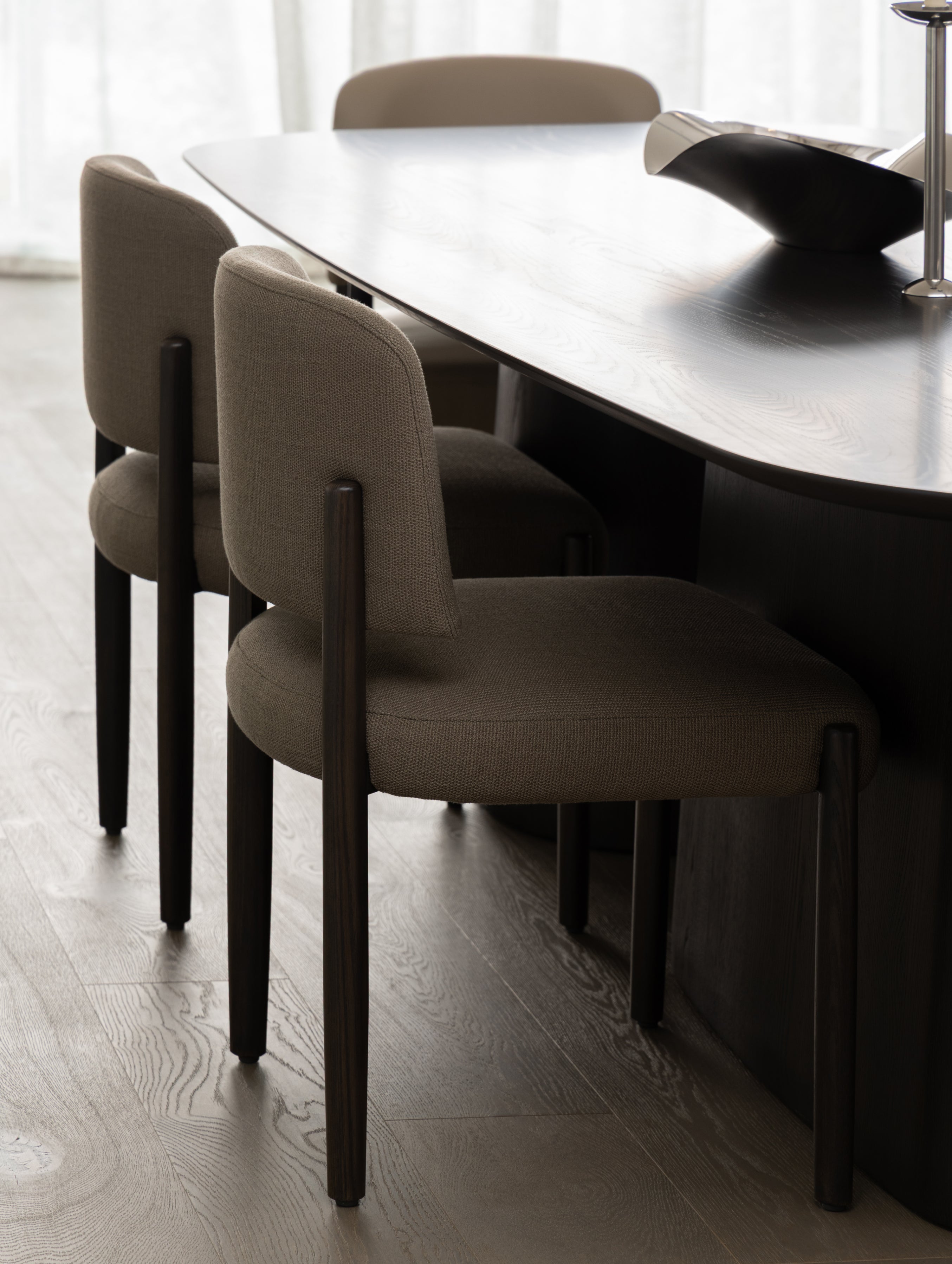 An inviting, fully upholstered side chair, Silas is designed with comfort and entertaining in mind. Its tailored upholstery pairs with a solid timber frame, while subtly swelled legs soften the overall form.